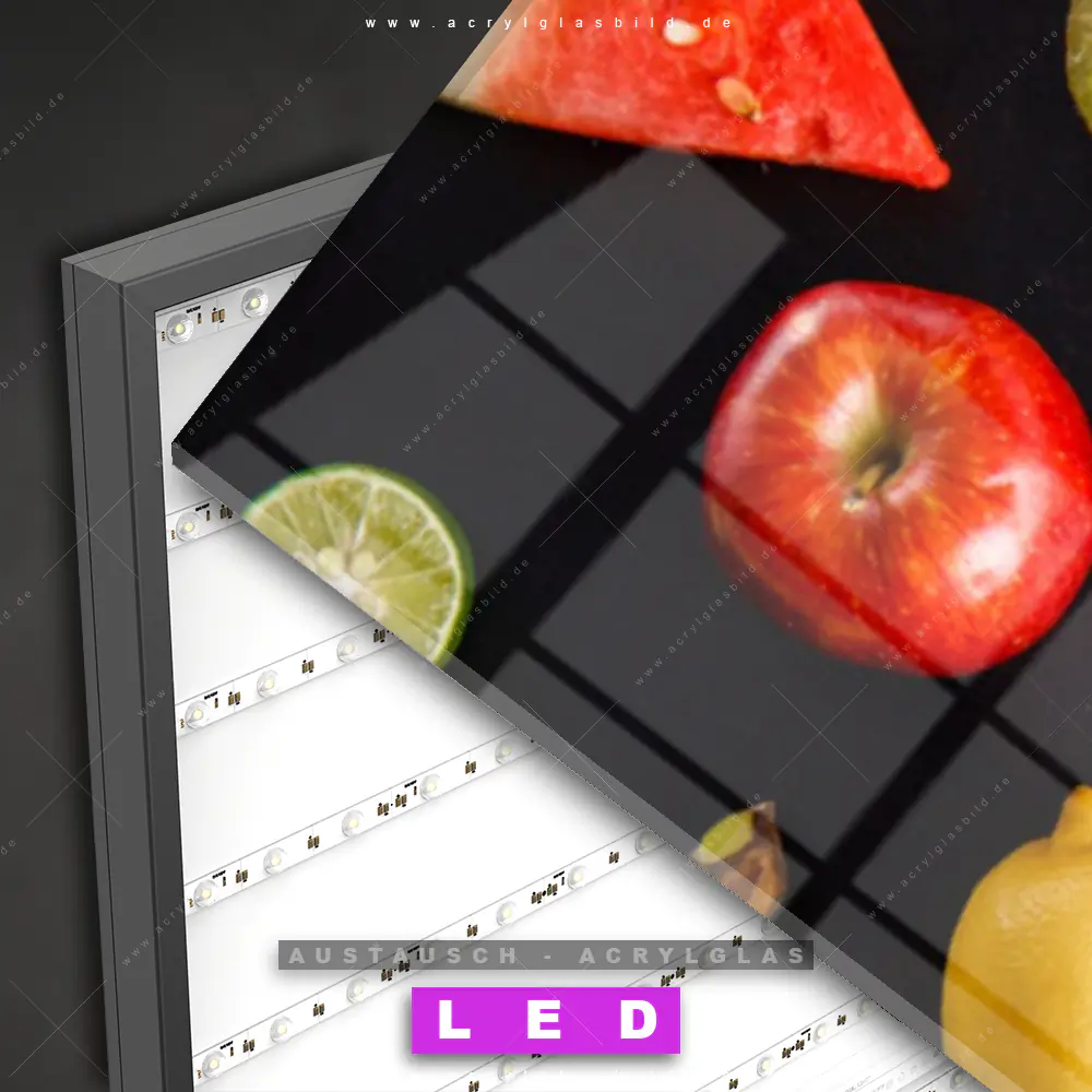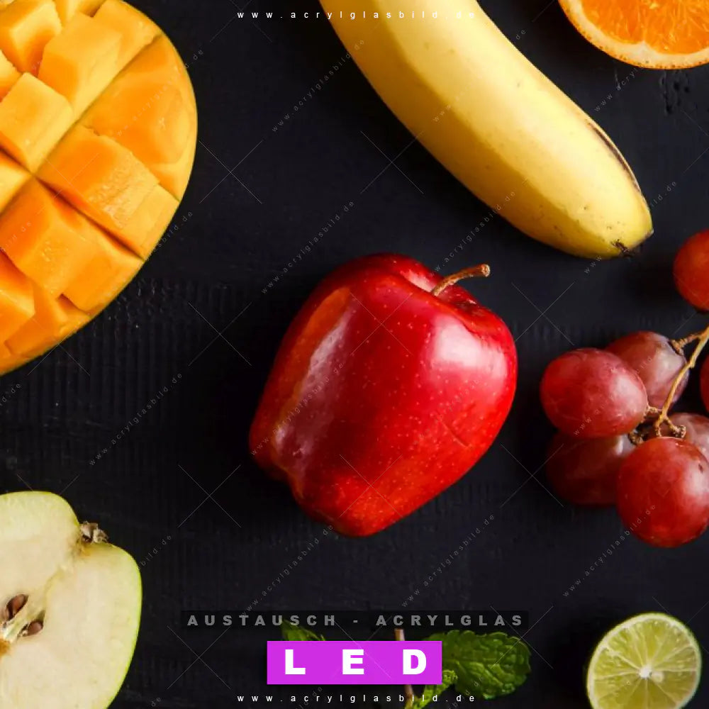 Begriffe wie Obst, Zitrusfrüchte, Früchte, frisch, spritzig, Orange, Apfel, Zitrone, Banane, Trauben, Melone haben dich auf der Suche nach deinem neuen Austausch-Acrylglasbild inspiriert? Dann sollte das Wechsel-Acrylglasbild Obstsorten für dein bereits vorhandenes LED Acrylglasbild Canvalight® DIA den Weg zu dir finden.