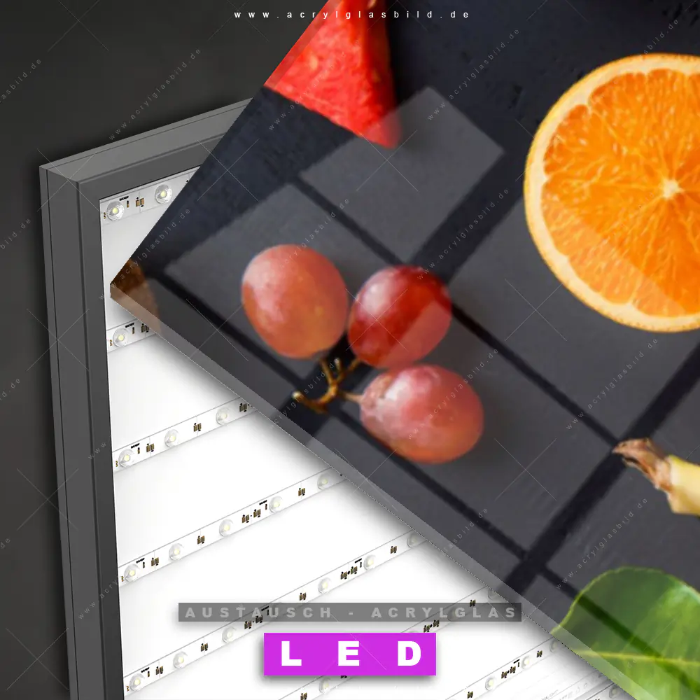 Begriffe wie Obst, Zitrusfrüchte, Früchte, frisch, spritzig, Orange, Apfel, Zitrone, Banane, Trauben, Melone haben dich auf der Suche nach deinem neuen Austausch-Acrylglasbild inspiriert? Dann sollte das Wechsel-Acrylglasbild Obstsorten für dein bereits vorhandenes LED Acrylglasbild Canvalight® DIA den Weg zu dir finden.