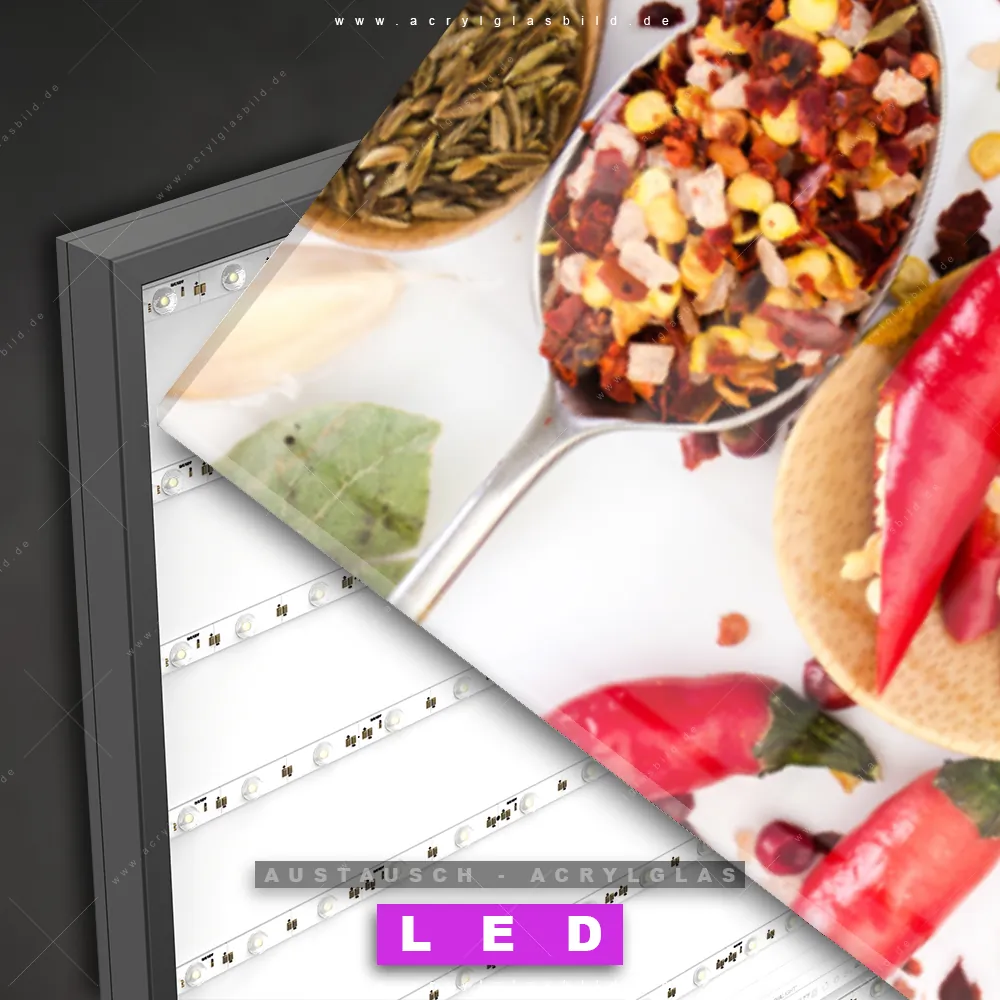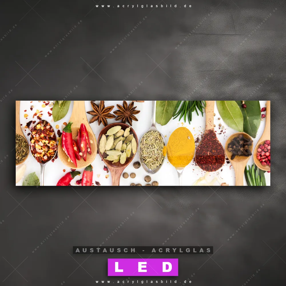 Begriffe wie Gewürze, Kräuter, Löffel, kochen, Pfeffer, Salz, Curry, Chili haben dich auf der Suche nach deinem neuen Austausch-Acrylglasbild inspiriert? Dann sollte das Wechsel-Acrylglasbild bunte Gewürz- und Kräutermischung für dein bereits vorhandenes LED Acrylglasbild Canvalight® DIA den Weg zu dir finden.