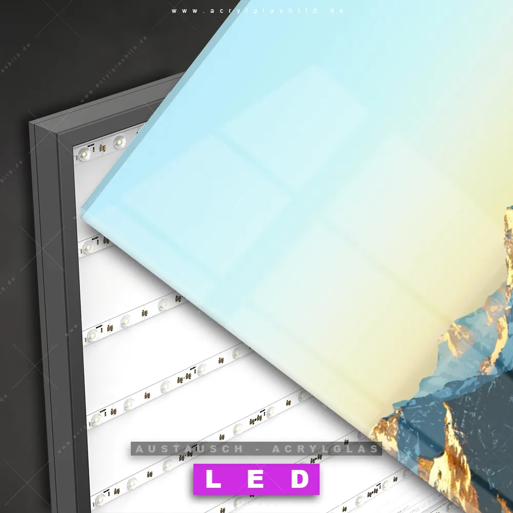 Begriffe wie Landschaft, Natur, Stille, Berge, Sonnenuntergang, Sonnenaufgang, Sonne, Gebirge, Nebel, Steine, Alpen haben dich auf der Suche nach deinem neuen Austausch-Acrylglasbild inspiriert? Dann sollte das Wechsel-Acrylglasbild Bergspitzen für dein bereits vorhandenes LED Acrylglasbild Canvalight® DIA den Weg zu dir finden.