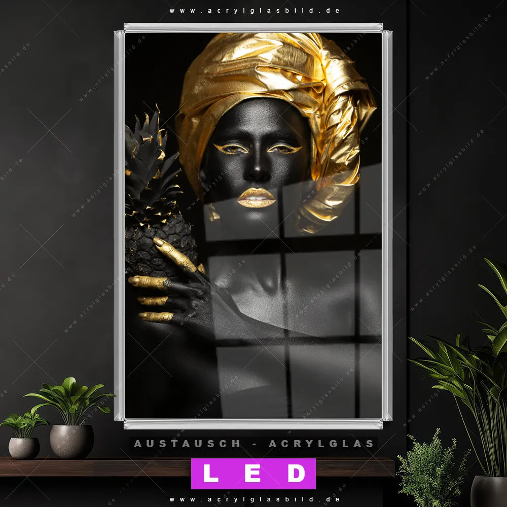 Begriffe wie Frau, Lippen, Mund, Ananas, Früchte, Gesicht, Körper, Beauty, Make-up, Gold haben dich auf der Suche nach deinem neuen Austausch-Acrylglasbild inspiriert? Dann sollte das Wechsel-Acrylglasbild Frau mit goldener Kopfbedeckung für dein bereits vorhandenes LED Acrylglasbild Canvalight® DIA den Weg zu dir finden.