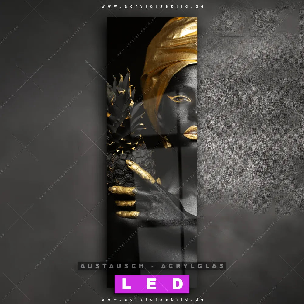 Begriffe wie Frau, Lippen, Mund, Ananas, Früchte, Gesicht, Körper, Beauty, Make-up, Gold haben dich auf der Suche nach deinem neuen Austausch-Acrylglasbild inspiriert? Dann sollte das Wechsel-Acrylglasbild Frau mit goldener Kopfbedeckung für dein bereits vorhandenes LED Acrylglasbild Canvalight® DIA den Weg zu dir finden.