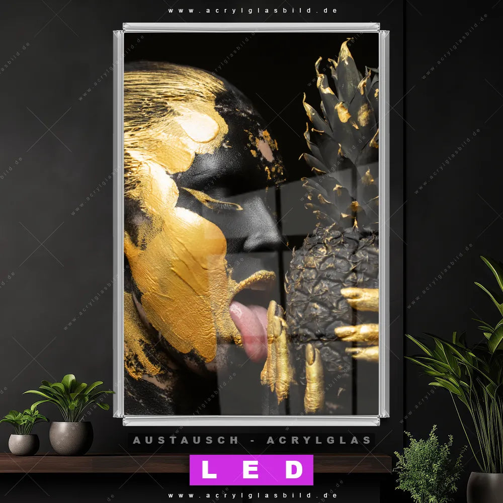 Begriffe wie Frau, Lippen, Mund, Ananas, Früchte, Gesicht, Körper, Beauty, Make-up, Gold haben dich auf der Suche nach deinem neuen Austausch-Acrylglasbild inspiriert? Dann sollte das Wechsel-Acrylglasbild Frau im Goldpuder für dein bereits vorhandenes LED Acrylglasbild Canvalight® DIA den Weg zu dir finden.