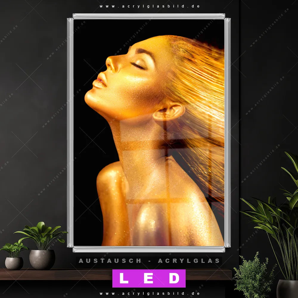 Begriffe wie Frau, Porträt, Erotik, modern, Gold, Farbe, Beauty, Haar, Gesicht, Körper haben dich auf der Suche nach deinem neuen Austausch-Acrylglasbild inspiriert? Dann sollte das Wechsel-Acrylglasbild Goldfrau für dein bereits vorhandenes LED Acrylglasbild Canvalight® DIA den Weg zu dir finden.