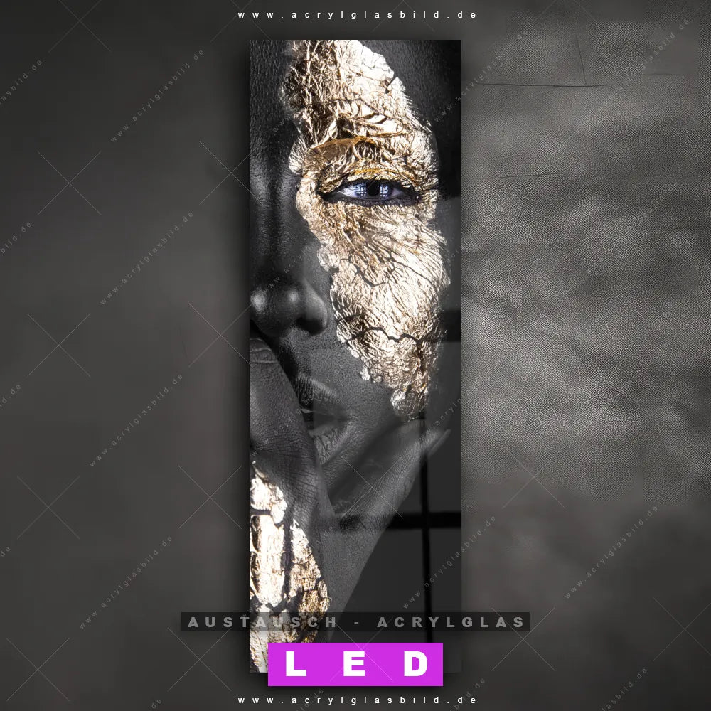 Begriffe wie Frau, Porträt, Erotik, modern, Gold, Farbe, Beauty, Gesicht, Körper, Make-up haben dich auf der Suche nach deinem neuen Austausch-Acrylglasbild inspiriert? Dann sollte das Wechsel-Acrylglasbild Porträt mit Blattgold für dein bereits vorhandenes LED Acrylglasbild Canvalight® DIA den Weg zu dir finden.