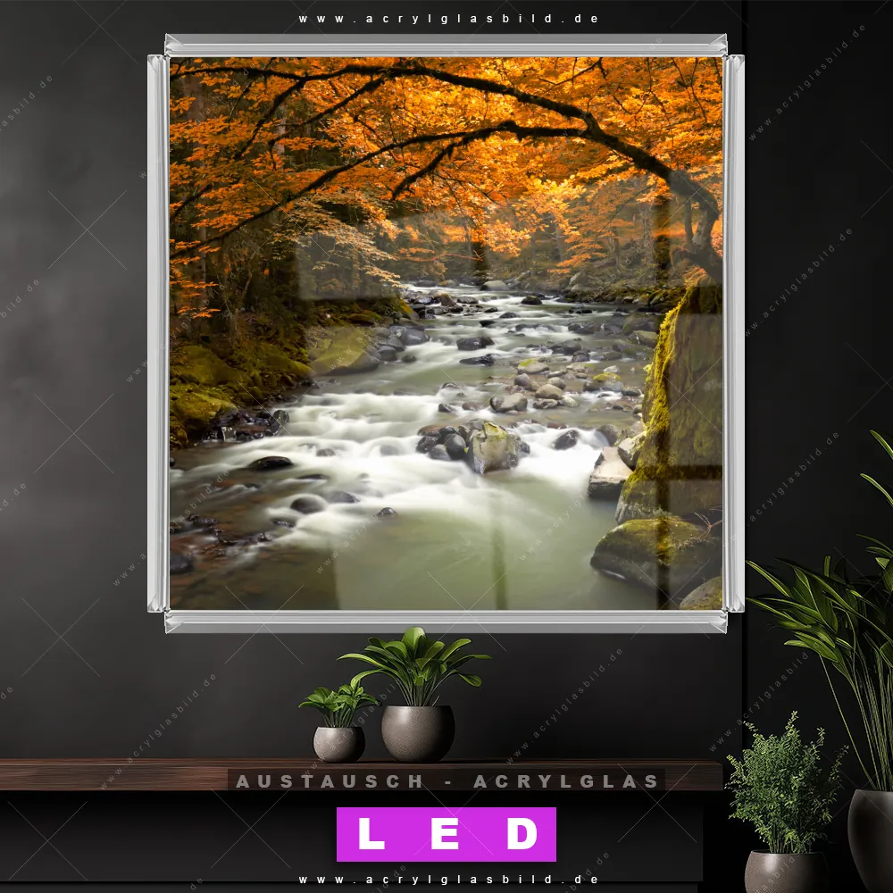 Begriffe wie Wald, Landschaft, Baum, Bäume, Natur, Laubwald, Fluss haben dich auf der Suche nach deinem neuen Austausch-Acrylglasbild inspiriert? Dann sollte das Wechsel-Acrylglasbild Fluss durch Herbstwald für dein bereits vorhandenes LED Acrylglasbild Canvalight® DIA den Weg zu dir finden.