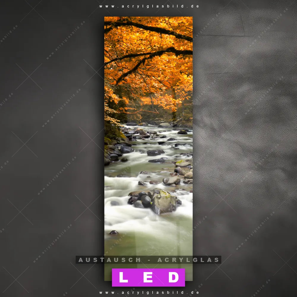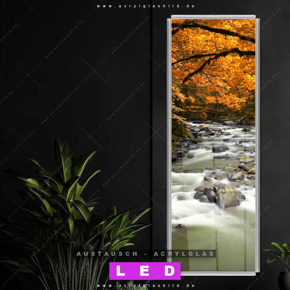 Begriffe wie Wald, Landschaft, Baum, Bäume, Natur, Laubwald, Fluss haben dich auf der Suche nach deinem neuen Austausch-Acrylglasbild inspiriert? Dann sollte das Wechsel-Acrylglasbild Fluss durch Herbstwald für dein bereits vorhandenes LED Acrylglasbild Canvalight® DIA den Weg zu dir finden.