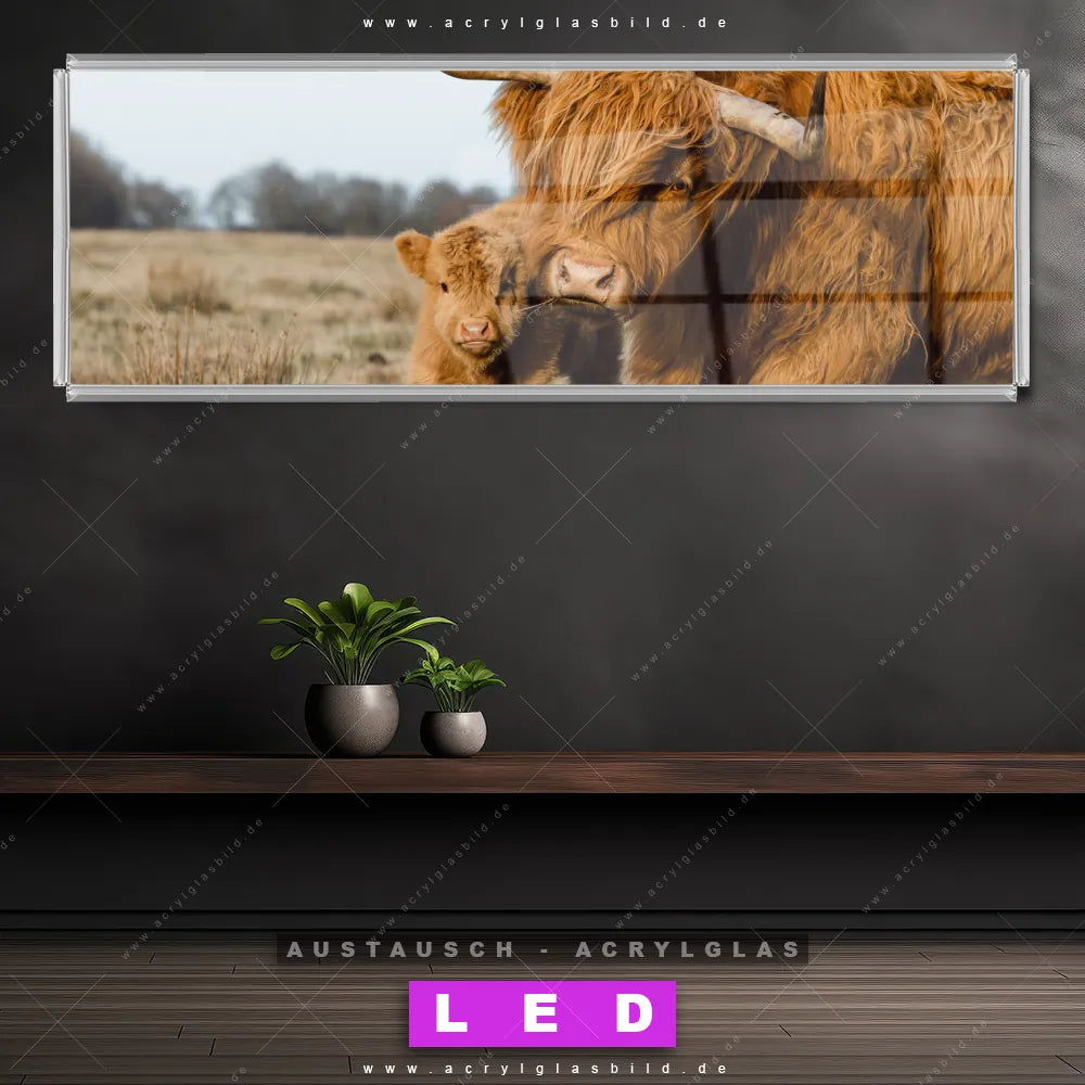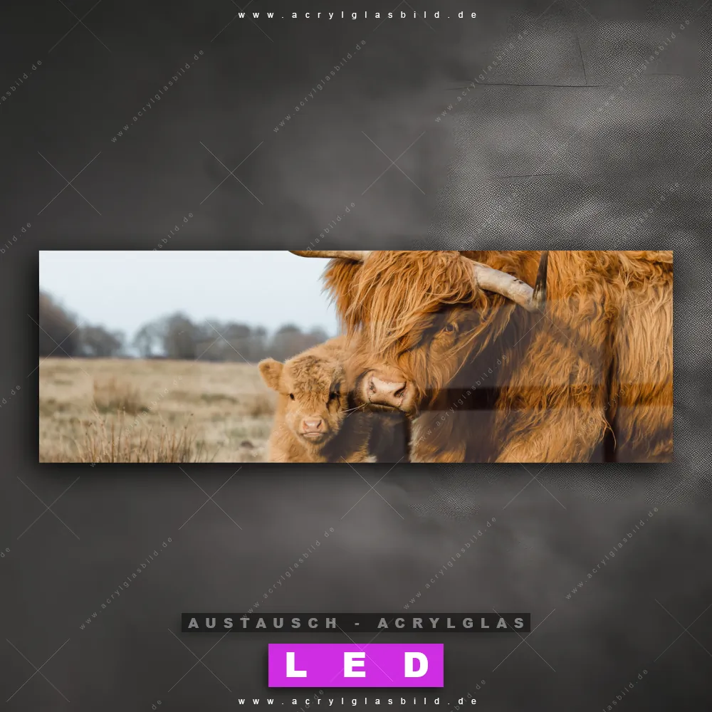 Begriffe wie Tier, Stier, Hochlandkuh, Highlander, Büffel, Rind, Bulle, Hochlandrind, Wiese, Weide, Hörner, Gras, Kalb, Kälbchen, Schottisch haben dich auf der Suche nach deinem neuen Austausch-Acrylglasbild inspiriert? Dann sollte das Wechsel-Acrylglasbild Hochlandrind Familie für dein bereits vorhandenes LED Acrylglasbild Canvalight® DIA den Weg zu dir finden.
