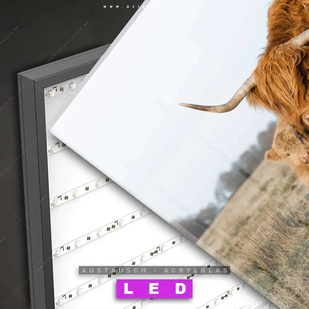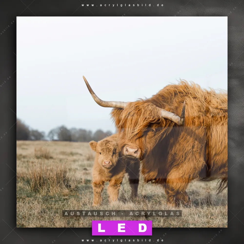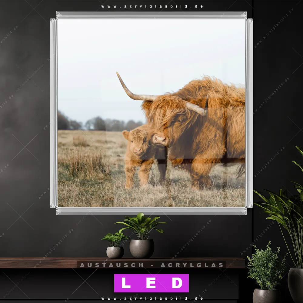 Begriffe wie Tier, Stier, Hochlandkuh, Highlander, Büffel, Rind, Bulle, Hochlandrind, Wiese, Weide, Hörner, Gras, Kalb, Kälbchen, Schottisch haben dich auf der Suche nach deinem neuen Austausch-Acrylglasbild inspiriert? Dann sollte das Wechsel-Acrylglasbild Hochlandrind Familie für dein bereits vorhandenes LED Acrylglasbild Canvalight® DIA den Weg zu dir finden.