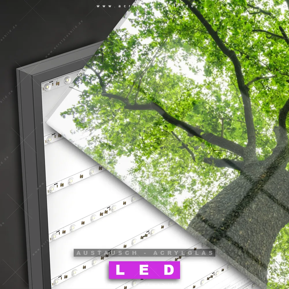 Begriffe wie Wald, Bäume, Natur, Baum, Ruhe, Stille, Baumkrone, Froschperspektive, Laubbaum, Buche, Eiche, Zweige haben dich auf der Suche nach deinem neuen Austausch-Acrylglasbild inspiriert? Dann sollte das Wechsel-Acrylglasbild Großer Laubbaum für dein bereits vorhandenes LED Acrylglasbild Canvalight® DIA den Weg zu dir finden.