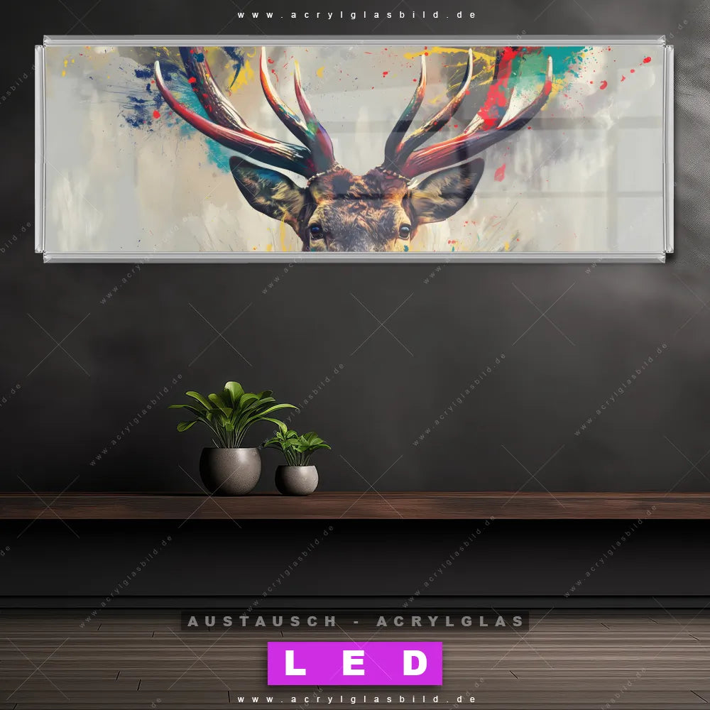 Wechsel-Acrylglas Canvalight® DIA | Kreativer Hirsch mit Farbspritzern | Panorama