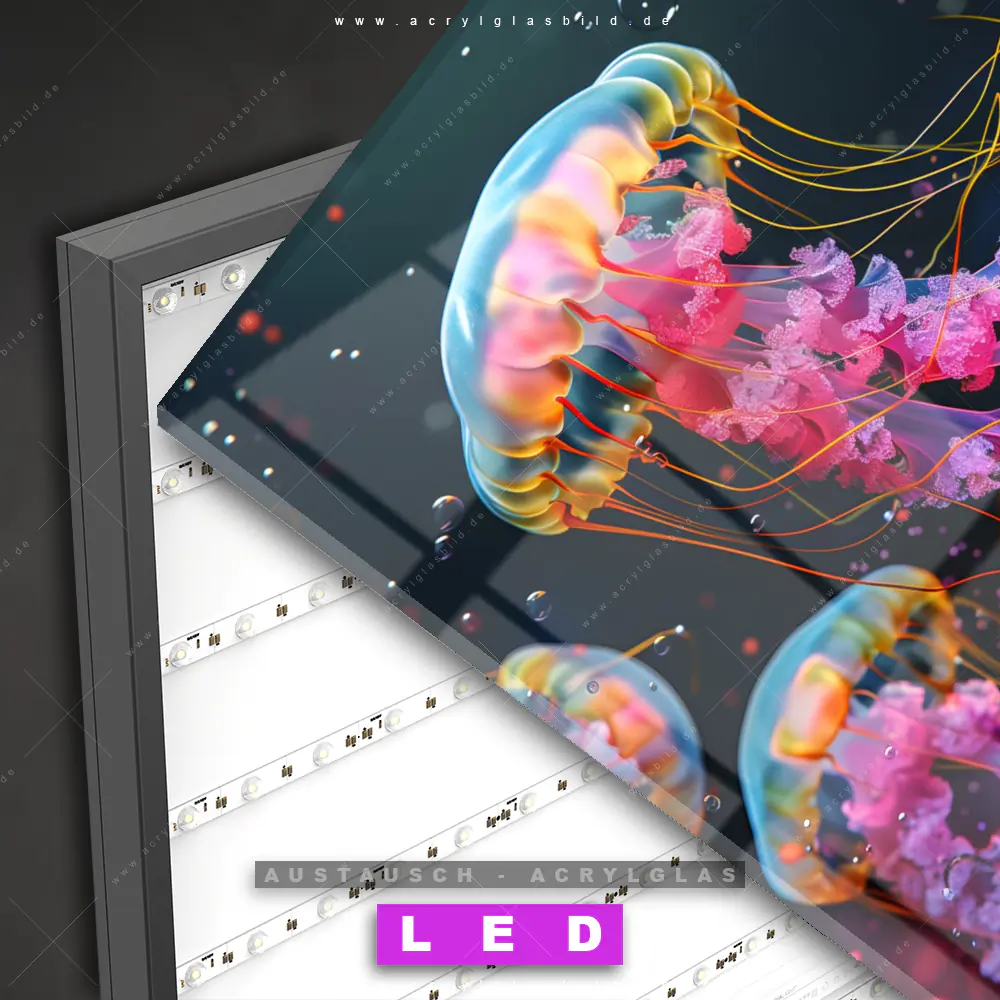 Begriffe wie Ozean, Unterwasserwelt, Korallenriff, Korallen, Meeresbewohner, Meer, Quallen haben dich auf der Suche nach deinem neuen Austausch-Acrylglasbild inspiriert? Dann sollte das Wechsel-Acrylglasbild Bunte Quallen im Ozean für dein bereits vorhandenes LED Acrylglasbild Canvalight® DIA den Weg zu dir finden.