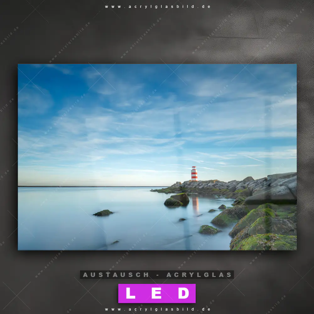 Begriffe wie Leuchtturm, Meer, Ostsee, Nordsee, Deutschland, Küste, Felsen, Horizont haben dich auf der Suche nach deinem neuen Austausch-Acrylglasbild inspiriert? Dann sollte das Wechsel-Acrylglasbild Leuchtturm am ruhigen Meer für dein bereits vorhandenes LED Acrylglasbild Canvalight® DIA den Weg zu dir finden.