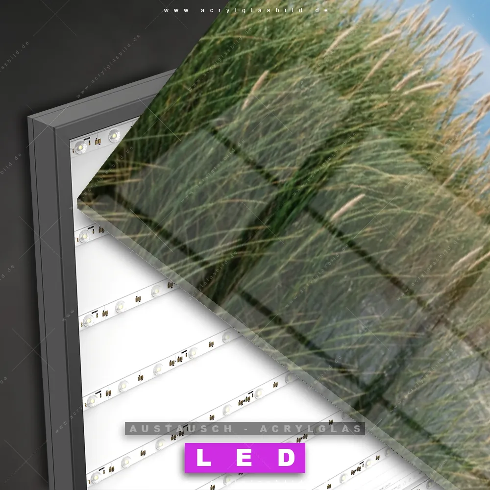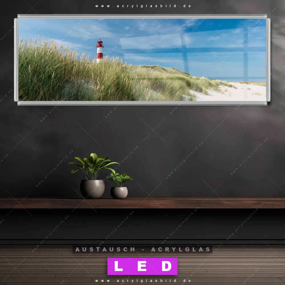 Begriffe wie Meer, Strand, Leuchtturm, Sommer, Deutschland, Reise, Düne, Ostsee, Nordsee, Gras haben dich auf der Suche nach deinem neuen Austausch-Acrylglasbild inspiriert? Dann sollte das Wechsel-Acrylglasbild Leuchtturm hinter Sanddünen für dein bereits vorhandenes LED Acrylglasbild Canvalight® DIA den Weg zu dir finden.