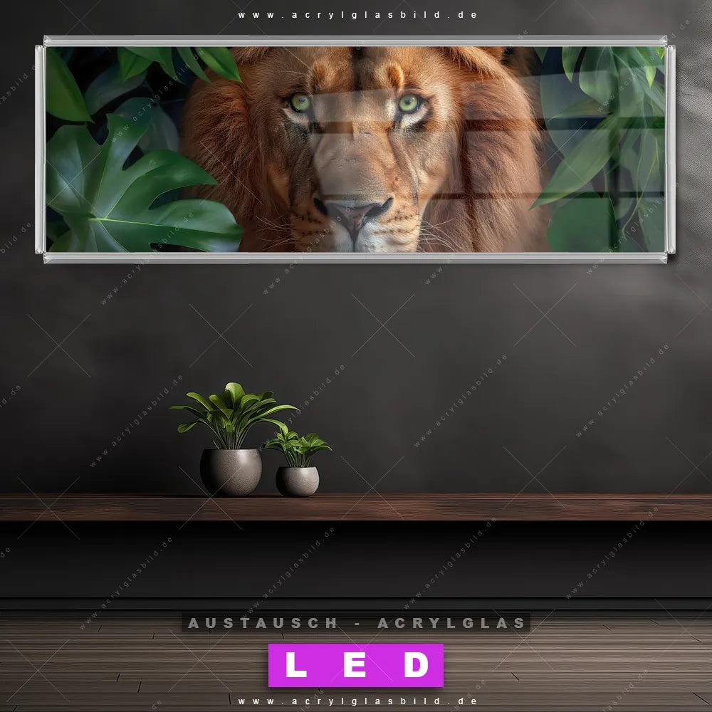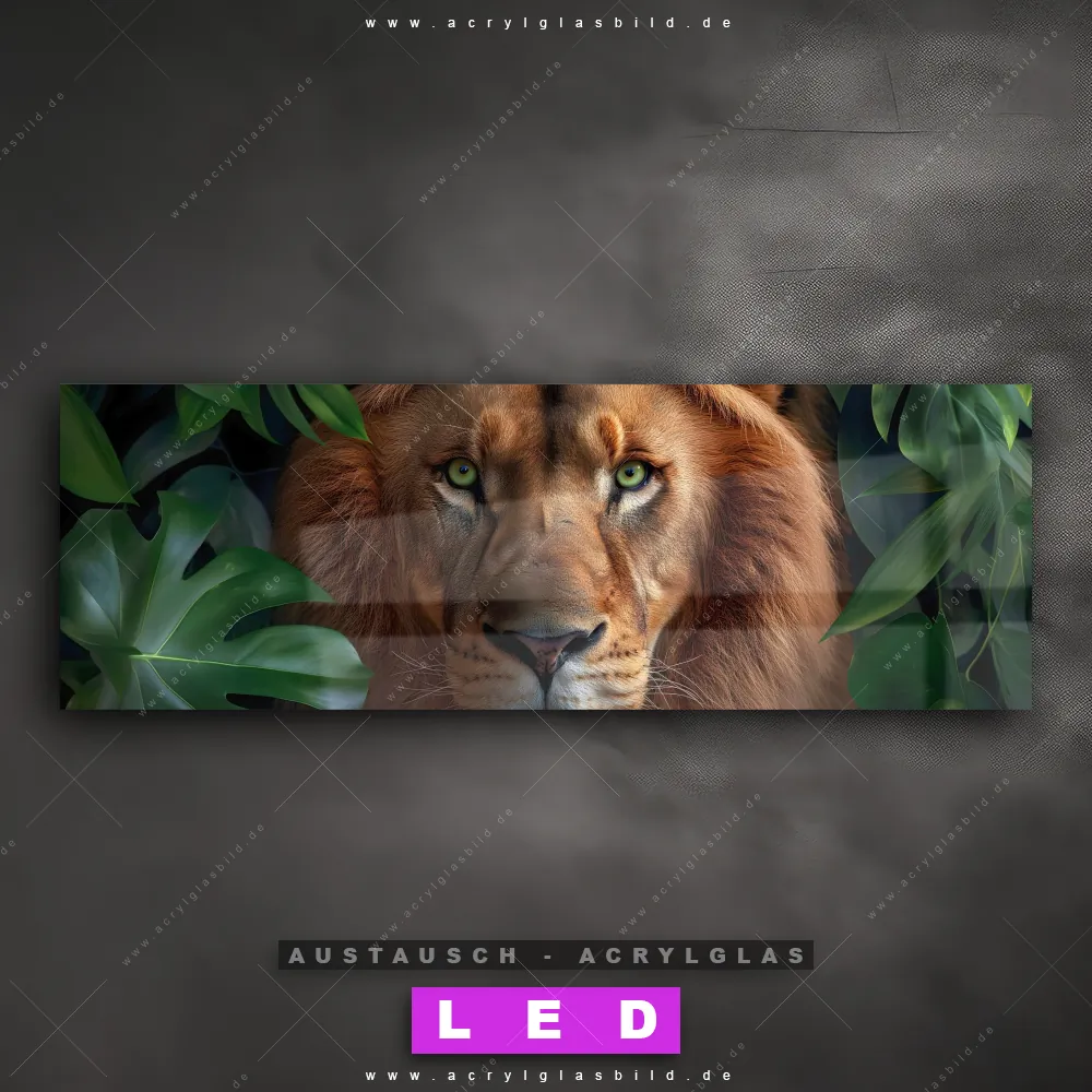 Begriffe wie Raubkatze, Löwe, Afrika, Lion, Tierporträt, Safari, Dschungel, Regenwald, Monstera, Blätter haben dich auf der Suche nach deinem neuen Austausch-Acrylglasbild inspiriert? Dann sollte das Wechsel-Acrylglasbild Löwe mit grünen Augen für dein bereits vorhandenes LED Acrylglasbild Canvalight® DIA den Weg zu dir finden.