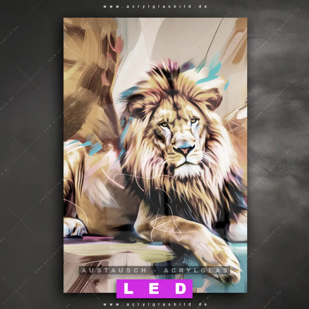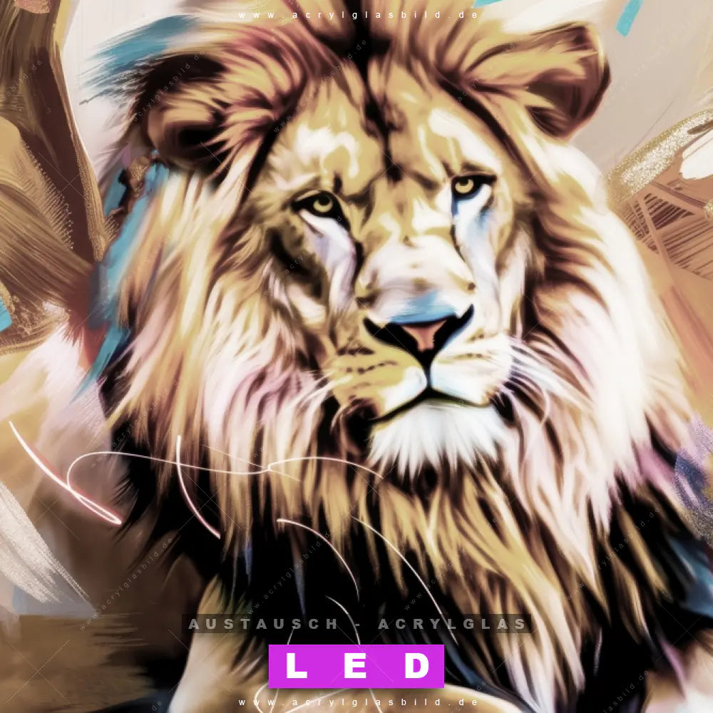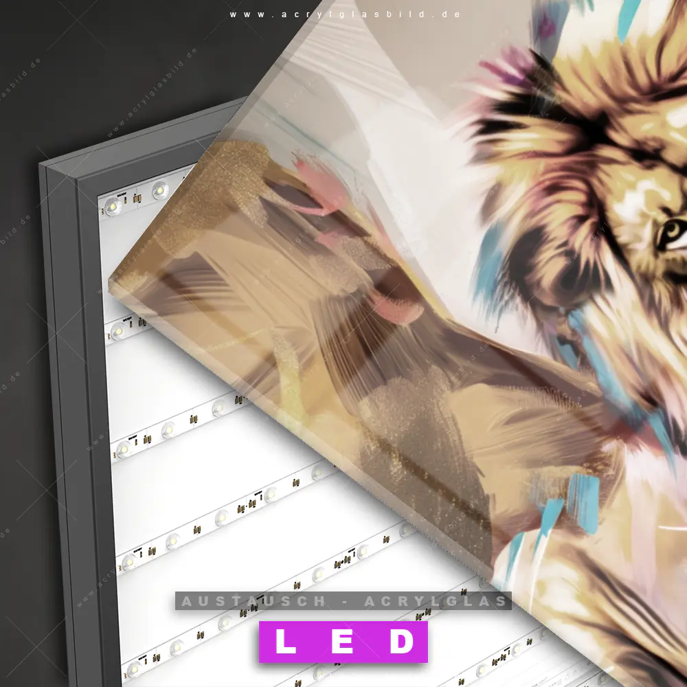 Begriffe wie Raubkatze, Löwe, Afrika, Dschungel, Lion, Graffiti, König, Wildtier, Farbe, Farbexplosion, Farbspritzer, Porträt haben dich auf der Suche nach deinem neuen Austausch-Acrylglasbild inspiriert? Dann sollte das Wechsel-Acrylglasbild Abstrakter Löwe für dein bereits vorhandenes LED Acrylglasbild Canvalight® DIA den Weg zu dir finden.