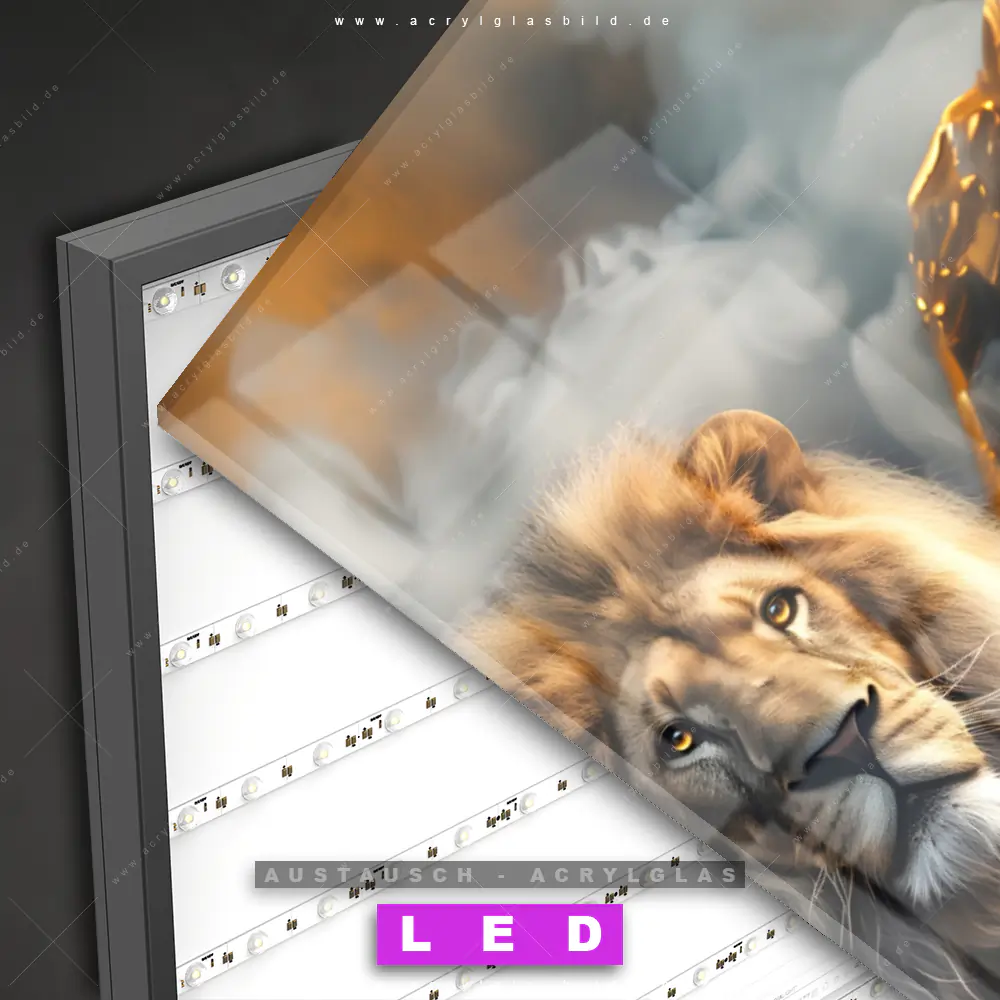 Begriffe wie Raubkatze, Löwe, Afrika, Dschungel, Lion, Rauch, Qualm, Wolken, Porträt, Tierporträt, Flügel, Engel haben dich auf der Suche nach deinem neuen Austausch-Acrylglasbild inspiriert? Dann sollte das Wechsel-Acrylglasbild Majestätischer Löwe in Nebel für dein bereits vorhandenes LED Acrylglasbild Canvalight® DIA den Weg zu dir finden.