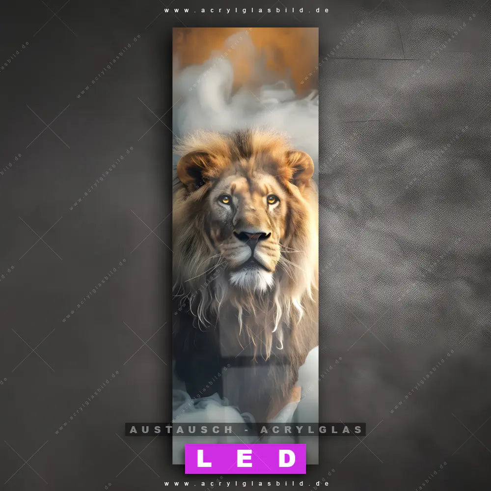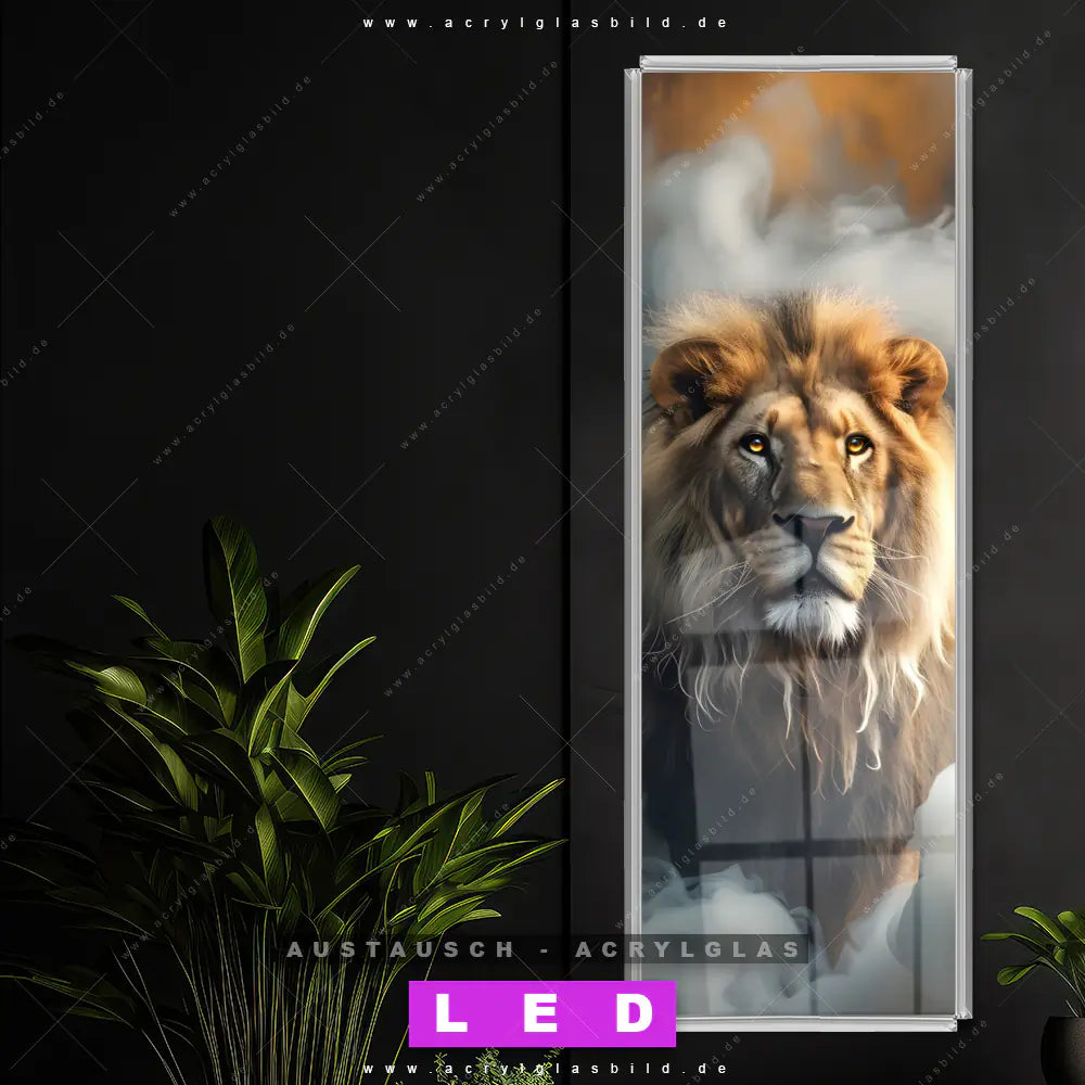 Begriffe wie Raubkatze, Löwe, Afrika, Dschungel, Lion, Rauch, Qualm, Wolken, Porträt, Tierporträt, Flügel, Engel haben dich auf der Suche nach deinem neuen Austausch-Acrylglasbild inspiriert? Dann sollte das Wechsel-Acrylglasbild Majestätischer Löwe in Nebel für dein bereits vorhandenes LED Acrylglasbild Canvalight® DIA den Weg zu dir finden.