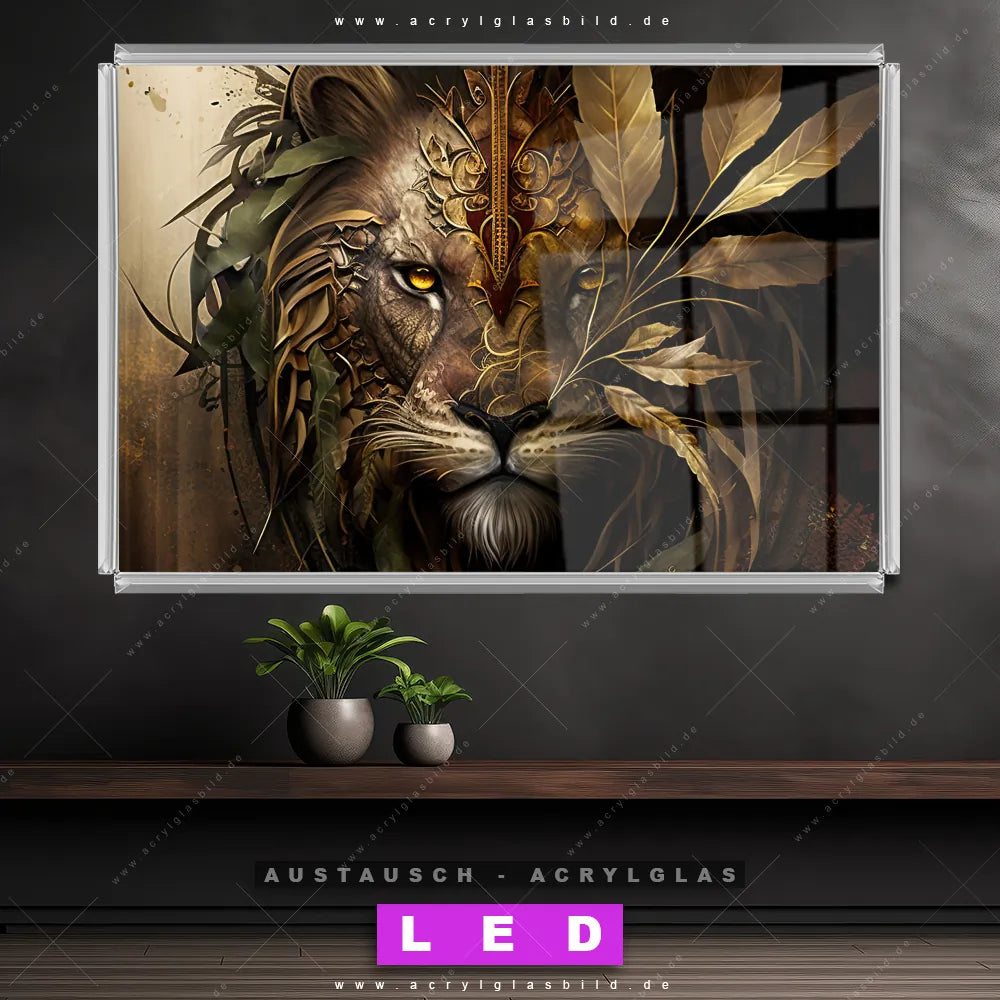 Begriffe wie Raubkatze, Löwe, Afrika, Dschungel, Blätter, Porträt haben dich auf der Suche nach deinem neuen Austausch-Acrylglasbild inspiriert? Dann sollte das Wechsel-Acrylglasbild Löwe mit Laubkrone für dein bereits vorhandenes LED Acrylglasbild Canvalight® DIA den Weg zu dir finden.