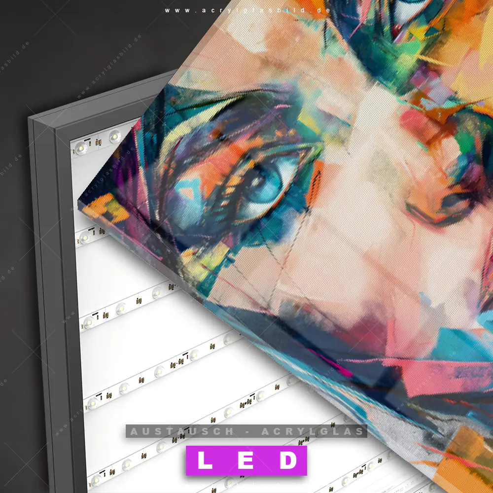 Begriffe wie Frau, Portrait, Gesicht, Kunst, Mädchen, Dame, Schönheit, Farbe, Kopf haben dich auf der Suche nach deinem neuen Austausch-Acrylglasbild inspiriert? Dann sollte das Wechsel-Acrylglasbild Porträt in leuchtenden Farben für dein bereits vorhandenes LED Acrylglasbild Canvalight® DIA den Weg zu dir finden.
