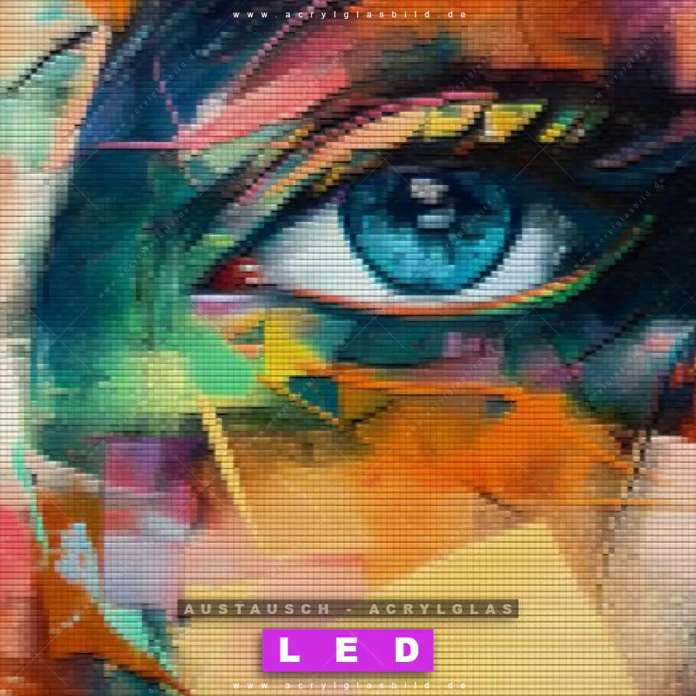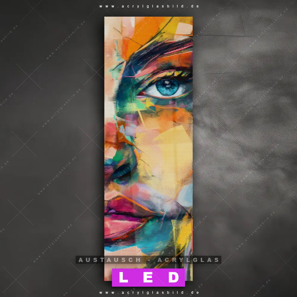 Begriffe wie Frau, Portrait, Gesicht, Kunst, Mädchen, Dame, Schönheit, Farbe, Kopf haben dich auf der Suche nach deinem neuen Austausch-Acrylglasbild inspiriert? Dann sollte das Wechsel-Acrylglasbild Porträt in leuchtenden Farben für dein bereits vorhandenes LED Acrylglasbild Canvalight® DIA den Weg zu dir finden.