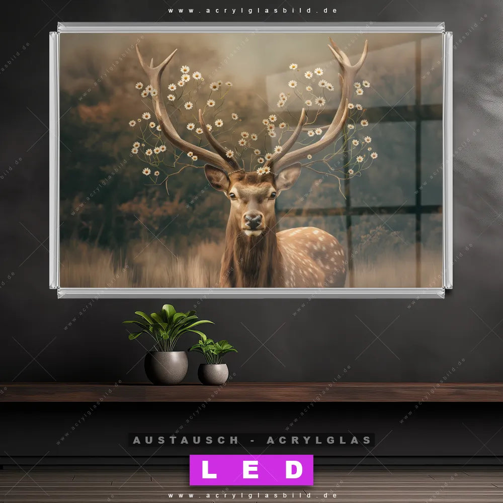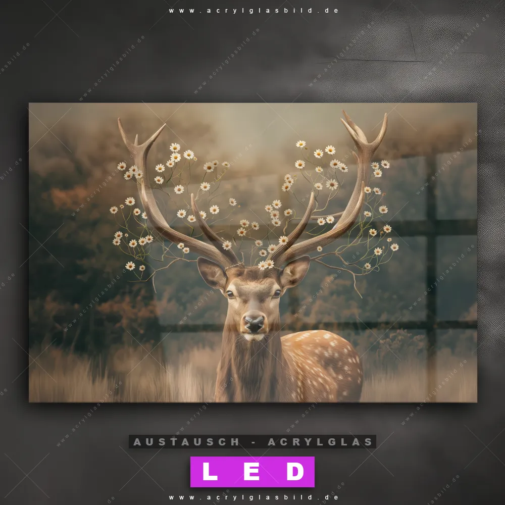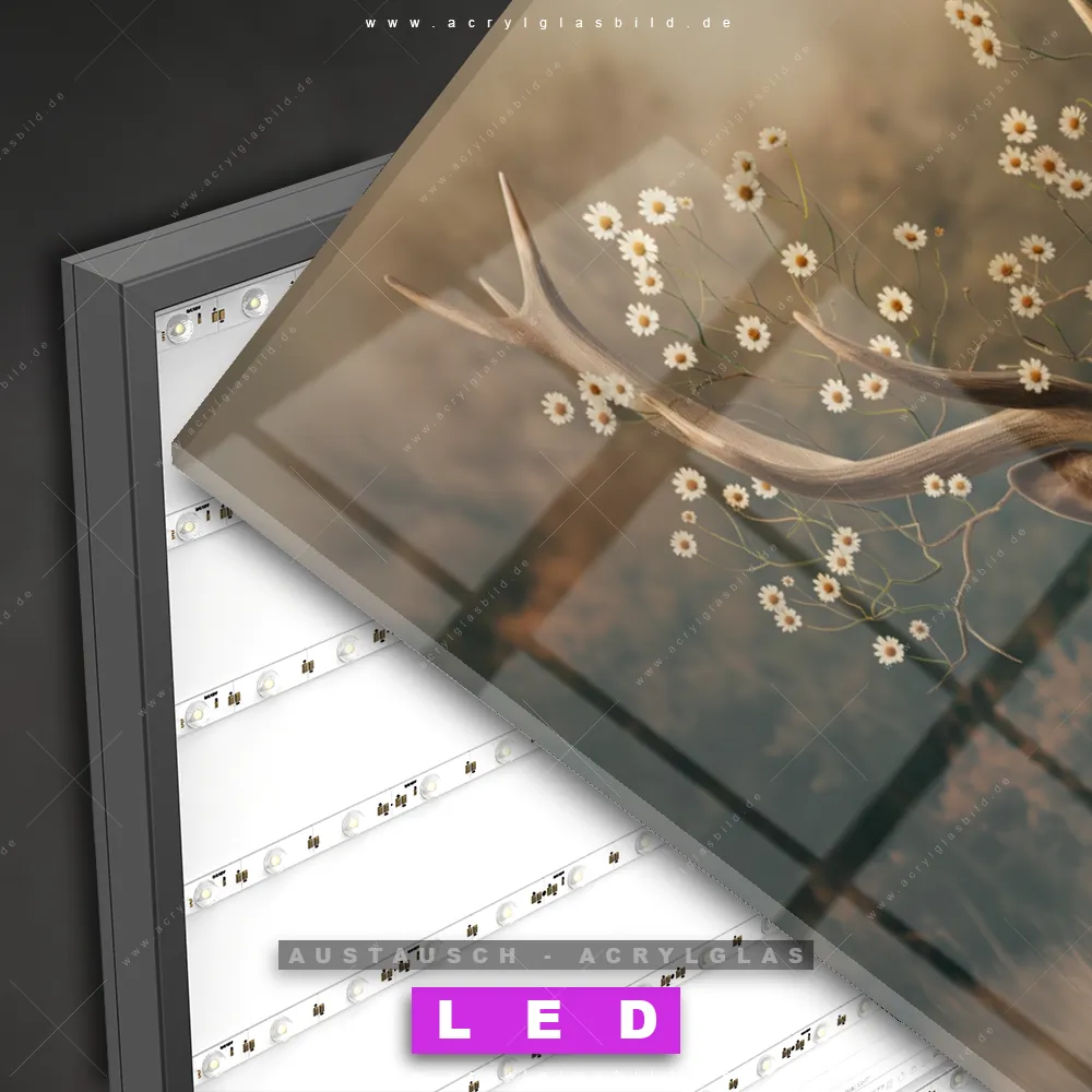 Begriffe wie Hirsch, Gänseblümchen, Rotwild, Wald, Blüten, Geweih, Blumen, Rothirsch haben dich auf der Suche nach deinem neuen Austausch-Acrylglasbild inspiriert? Dann sollte das Wechsel-Acrylglasbild Rotwild mit blumengeschmücktem Geweih für dein bereits vorhandenes LED Acrylglasbild Canvalight® DIA den Weg zu dir finden.