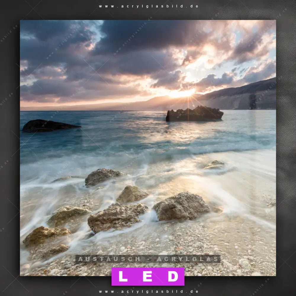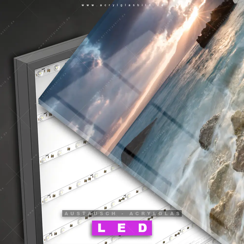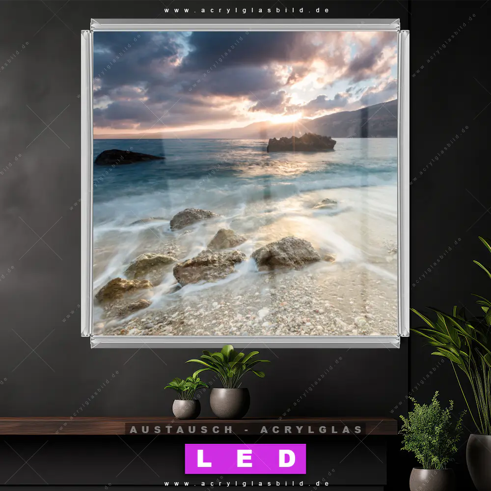 Begriffe wie Sommer, Ostsee, Nordsee, Sonnenuntergang, Sonnenaufgang, Natur, Urlaub, Reisen, Meer, Strand, Insel, Steine, Felsen haben dich auf der Suche nach deinem neuen Austausch-Acrylglasbild inspiriert? Dann sollte das Wechsel-Acrylglasbild Sonnenuntergang am Meeresufer für dein bereits vorhandenes LED Acrylglasbild Canvalight® DIA den Weg zu dir finden.