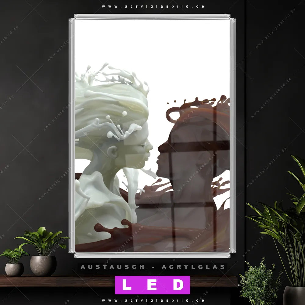Begriffe wie Kuss, Liebe, Milch, Schokolade, Flüssigkeit, Mann, Frau, Paar, Kaffee haben dich auf der Suche nach deinem neuen Austausch-Acrylglasbild inspiriert? Dann sollte das Wechsel-Acrylglasbild Milch & Kaffee mit Gesicht für dein bereits vorhandenes LED Acrylglasbild Canvalight® DIA den Weg zu dir finden.