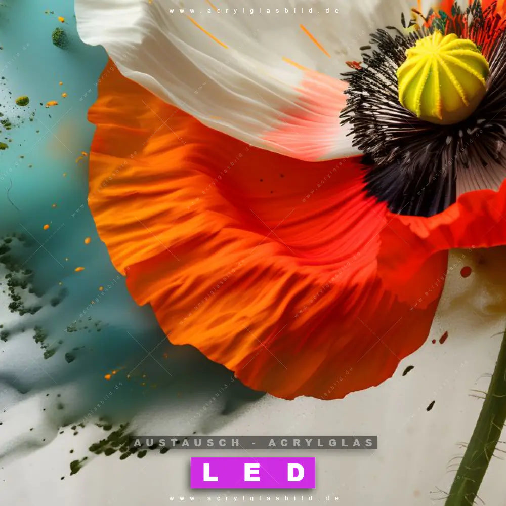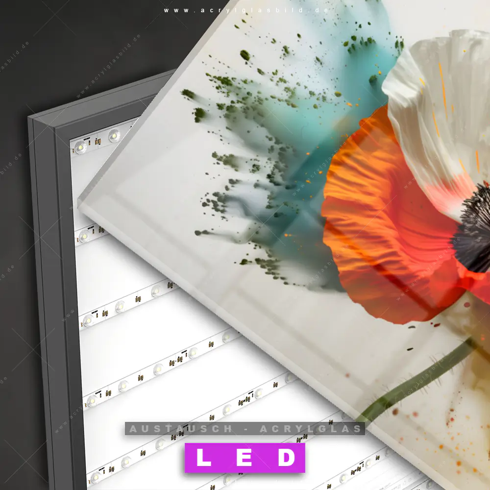 Begriffe wie Pflanze, Natur, Blüten, Mohnblumen, Blumenwiese, Klatschmohn, Blumen, Farbnebel, Farbwolke, Farbpulver haben dich auf der Suche nach deinem neuen Austausch-Acrylglasbild inspiriert? Dann sollte das Wechsel-Acrylglasbild Farbexplosion Mohnblume für dein bereits vorhandenes LED Acrylglasbild Canvalight® DIA den Weg zu dir finden.