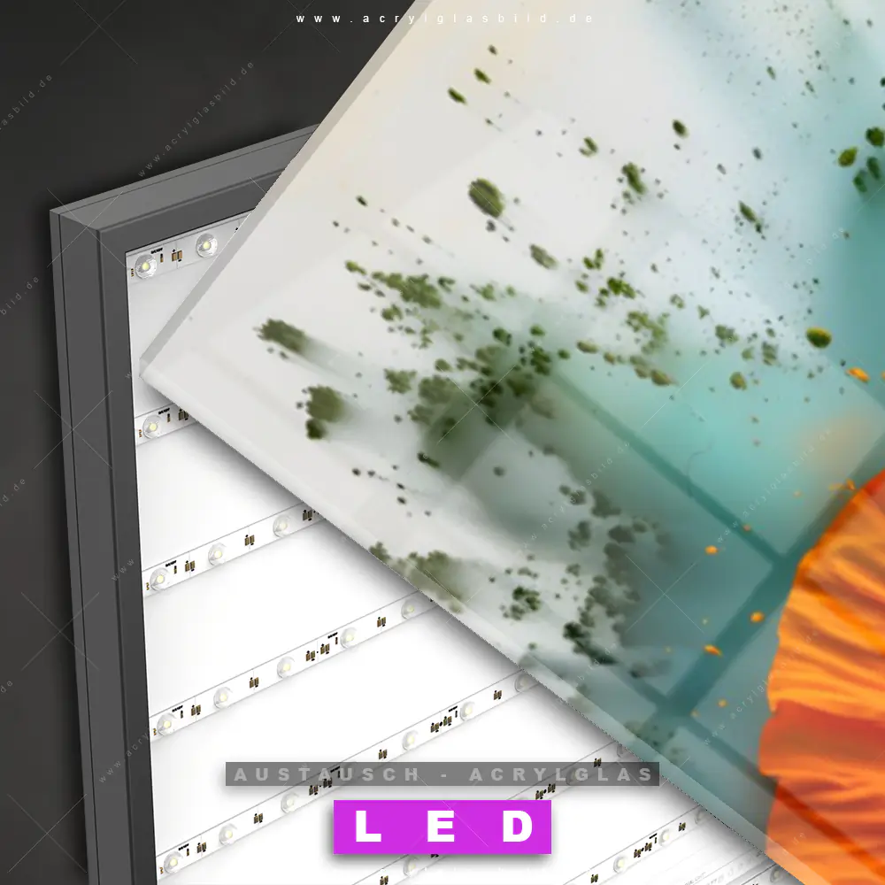 Begriffe wie Pflanze, Natur, Blüten, Mohnblumen, Blumenwiese, Klatschmohn, Blumen, Farbnebel, Farbwolke, Farbpulver haben dich auf der Suche nach deinem neuen Austausch-Acrylglasbild inspiriert? Dann sollte das Wechsel-Acrylglasbild Farbexplosion Mohnblume für dein bereits vorhandenes LED Acrylglasbild Canvalight® DIA den Weg zu dir finden.