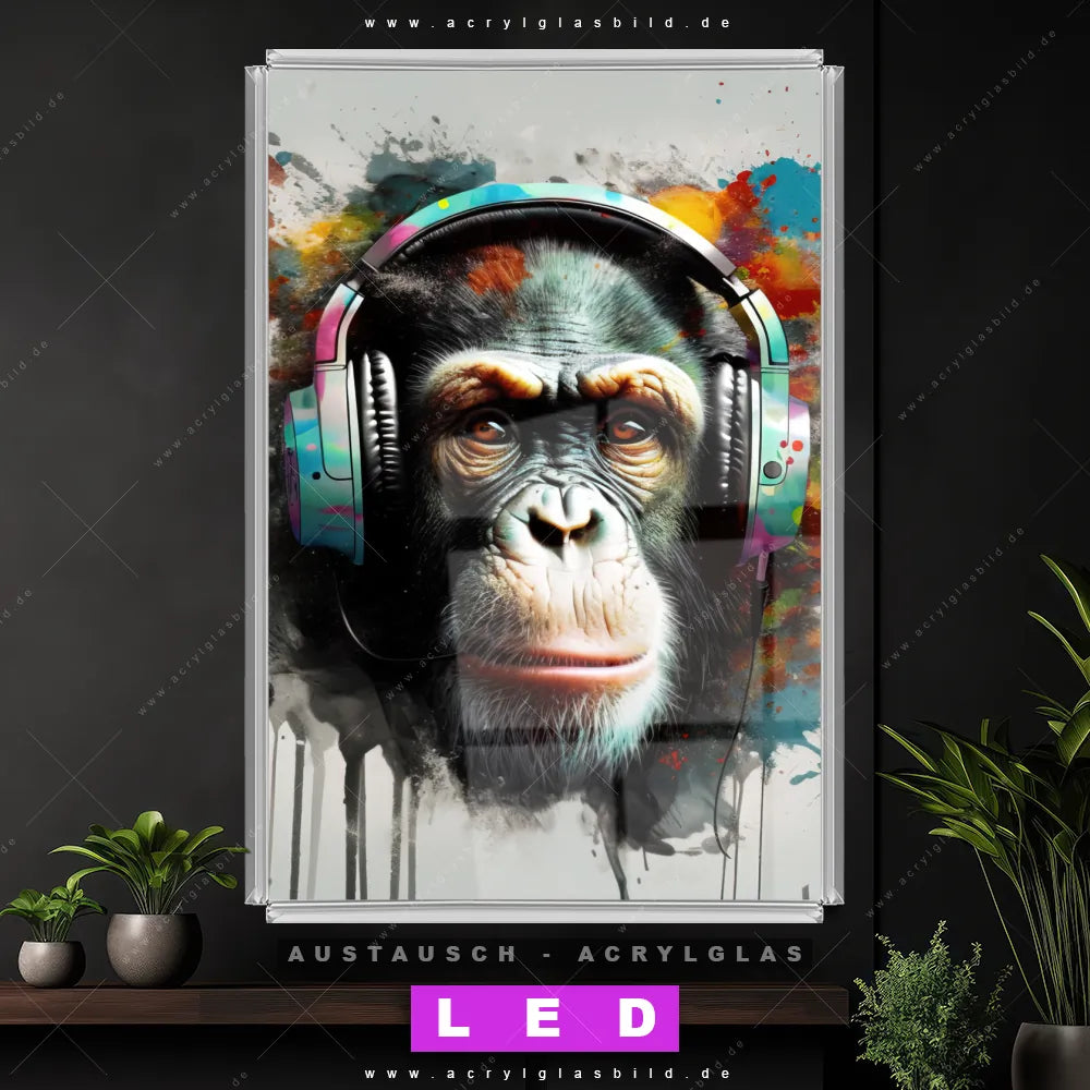 Begriffe wie Tier, Affe, Monkey, Chimpanzee, Schimpanse, Farbspritzer, Kopfhörer, Musik haben dich auf der Suche nach deinem neuen Austausch-Acrylglasbild inspiriert? Dann sollte das Wechsel-Acrylglasbild Schimpanse in bunten Farben für dein bereits vorhandenes LED Acrylglasbild Canvalight® DIA den Weg zu dir finden.
