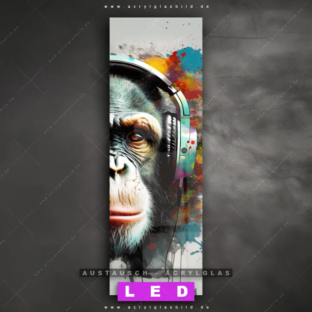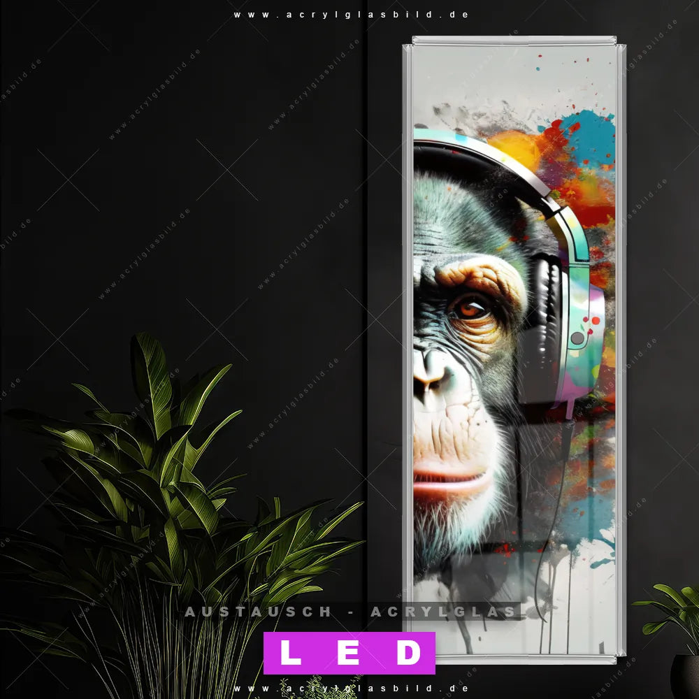Begriffe wie Tier, Affe, Monkey, Chimpanzee, Schimpanse, Farbspritzer, Kopfhörer, Musik haben dich auf der Suche nach deinem neuen Austausch-Acrylglasbild inspiriert? Dann sollte das Wechsel-Acrylglasbild Schimpanse in bunten Farben für dein bereits vorhandenes LED Acrylglasbild Canvalight® DIA den Weg zu dir finden.
