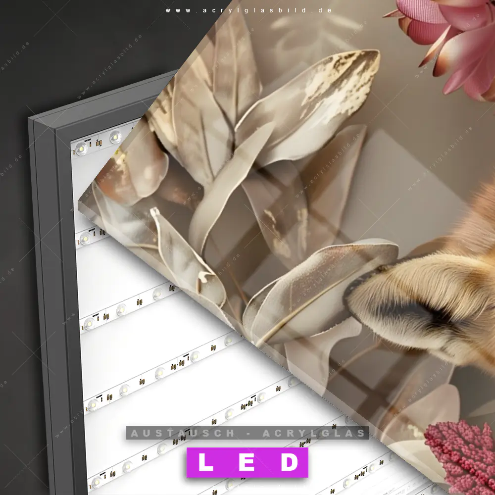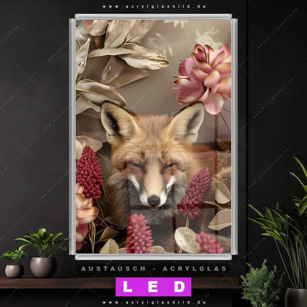Begriffe wie Fuchs, Natur, Rotfuchs, Tier, Tierporträt, Nahaufnahme, Blätter, Blumen, Blüten haben dich auf der Suche nach deinem neuen Austausch-Acrylglasbild inspiriert? Dann sollte das Wechsel-Acrylglasbild Der Fuchs - Florales Tierporträt für dein bereits vorhandenes LED Acrylglasbild Canvalight® DIA den Weg zu dir finden.