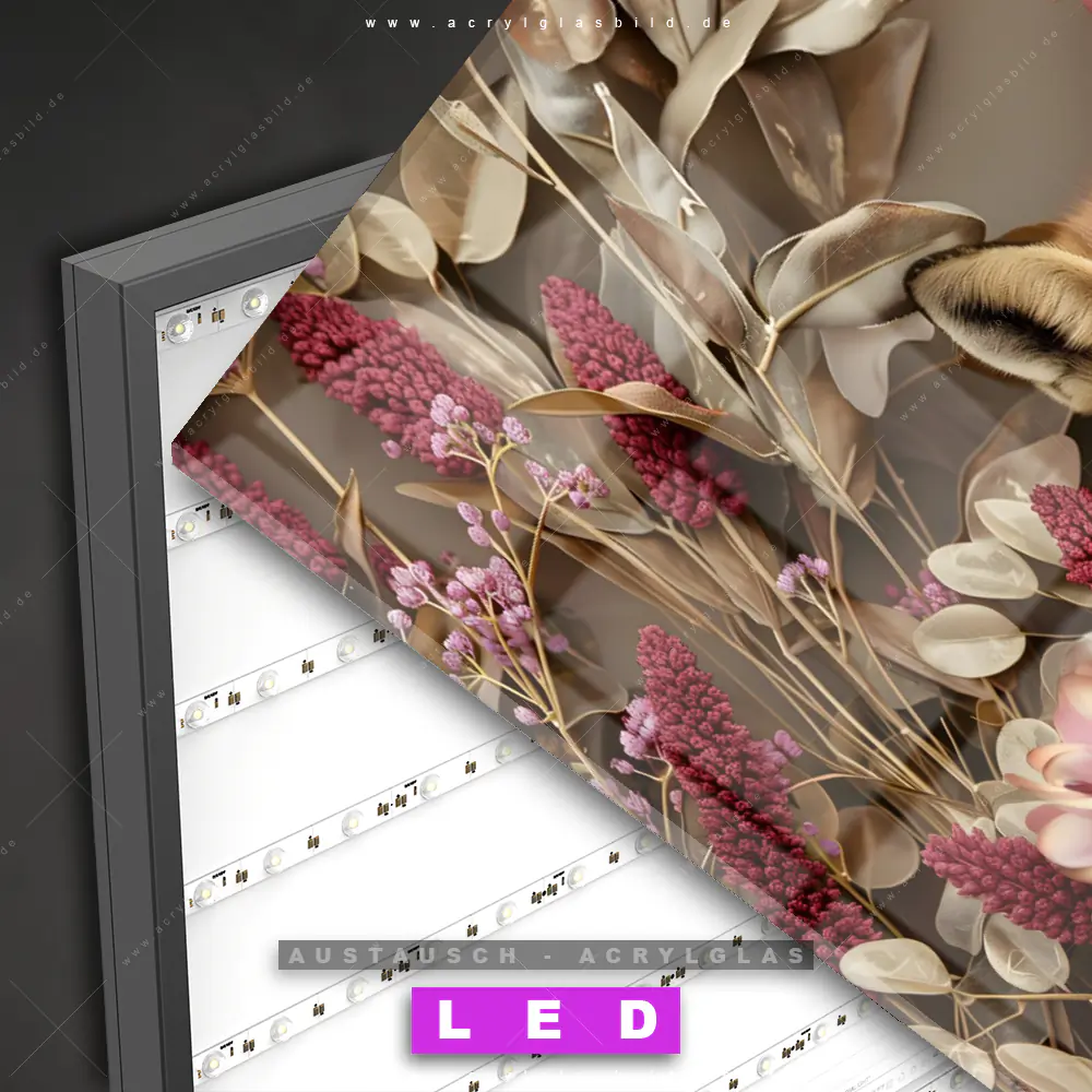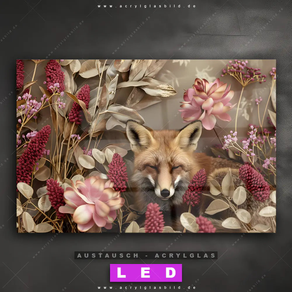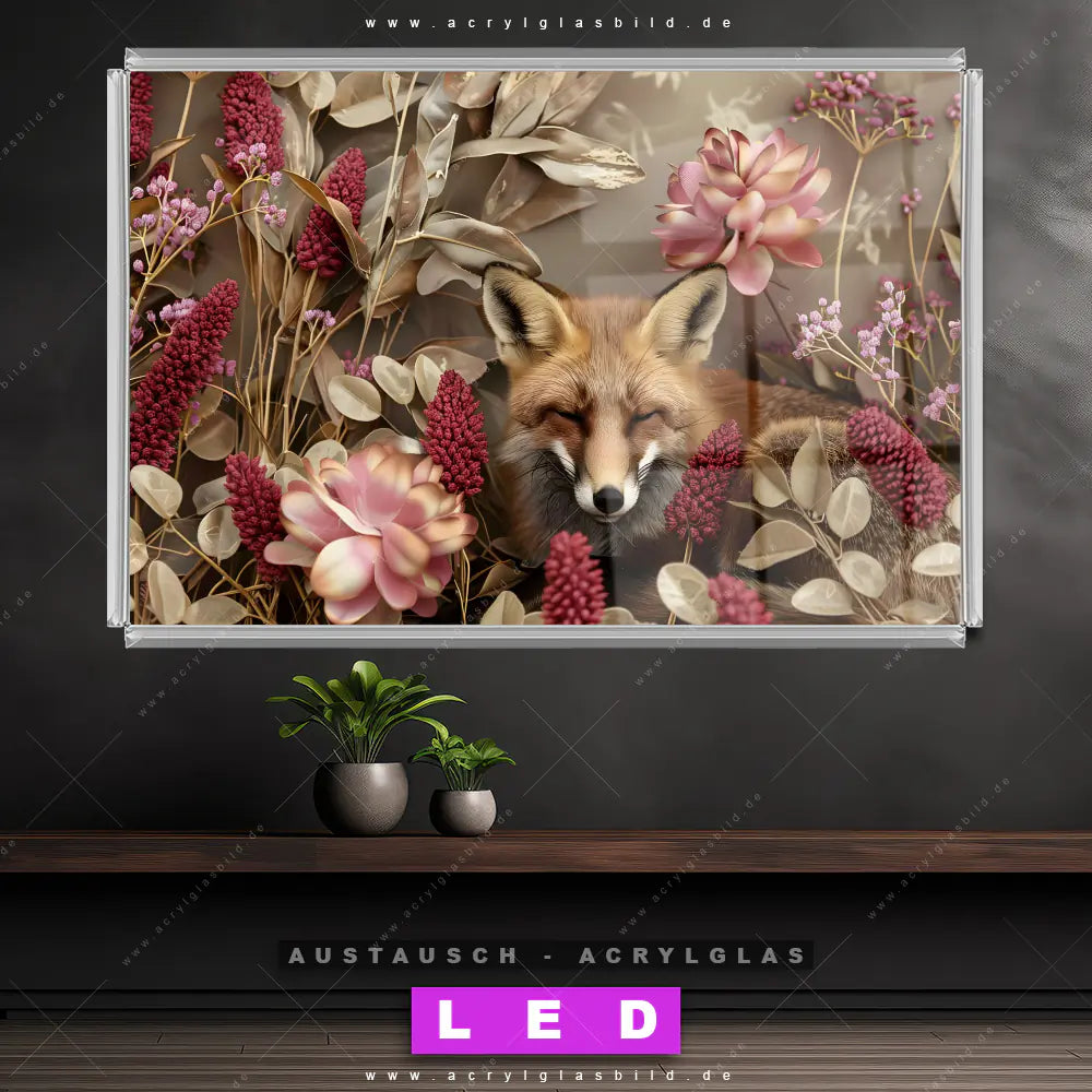 Begriffe wie Fuchs, Natur, Rotfuchs, Tier, Tierporträt, Nahaufnahme, Blätter, Blumen, Blüten haben dich auf der Suche nach deinem neuen Austausch-Acrylglasbild inspiriert? Dann sollte das Wechsel-Acrylglasbild Der Fuchs - Florales Tierporträt für dein bereits vorhandenes LED Acrylglasbild Canvalight® DIA den Weg zu dir finden.