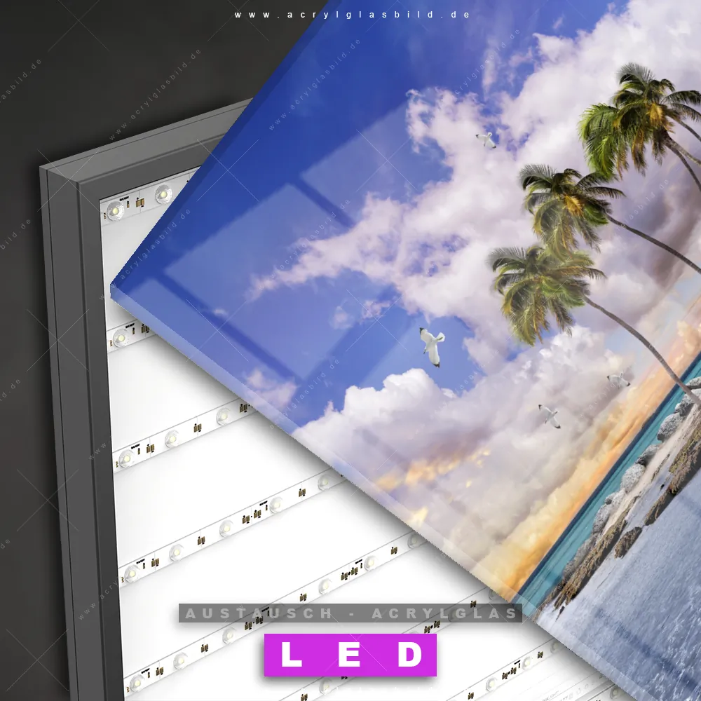 Begriffe wie Ozean, Palmen, Tropen, Insel, Sommer, Südsee - Karibik, Urlaub - Reisen, Sonnenuntergang - Sonnenaufgang haben dich auf der Suche nach deinem neuen Austausch-Acrylglasbild inspiriert? Dann sollte das Wechsel-Acrylglasbild Insel mit tropischen Palmen für dein bereits vorhandenes LED Acrylglasbild Canvalight® DIA den Weg zu dir finden.