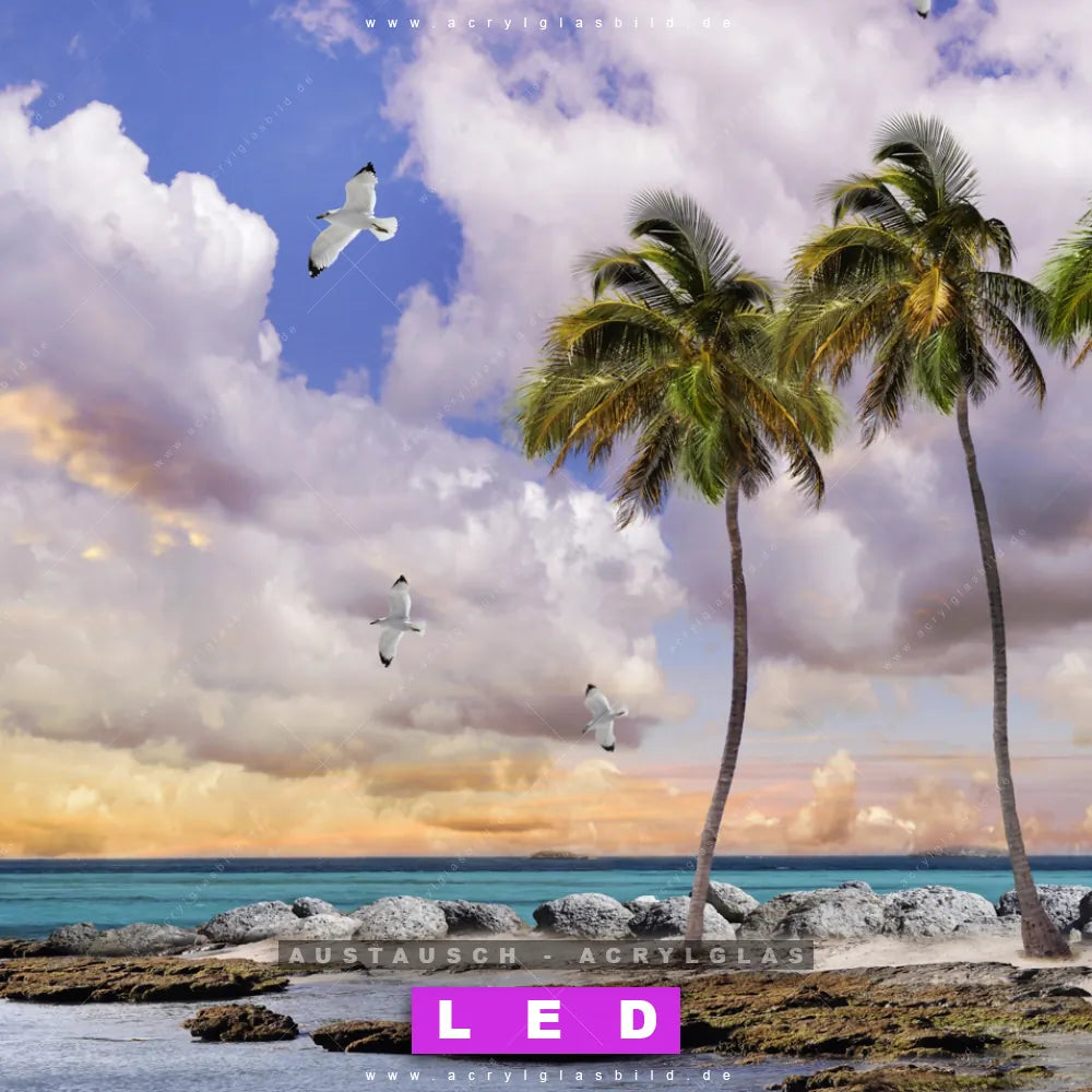 Begriffe wie Ozean, Palmen, Tropen, Insel, Sommer, Südsee - Karibik, Urlaub - Reisen, Sonnenuntergang - Sonnenaufgang haben dich auf der Suche nach deinem neuen Austausch-Acrylglasbild inspiriert? Dann sollte das Wechsel-Acrylglasbild Insel mit tropischen Palmen für dein bereits vorhandenes LED Acrylglasbild Canvalight® DIA den Weg zu dir finden.