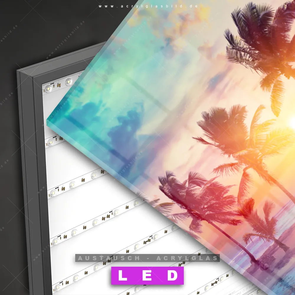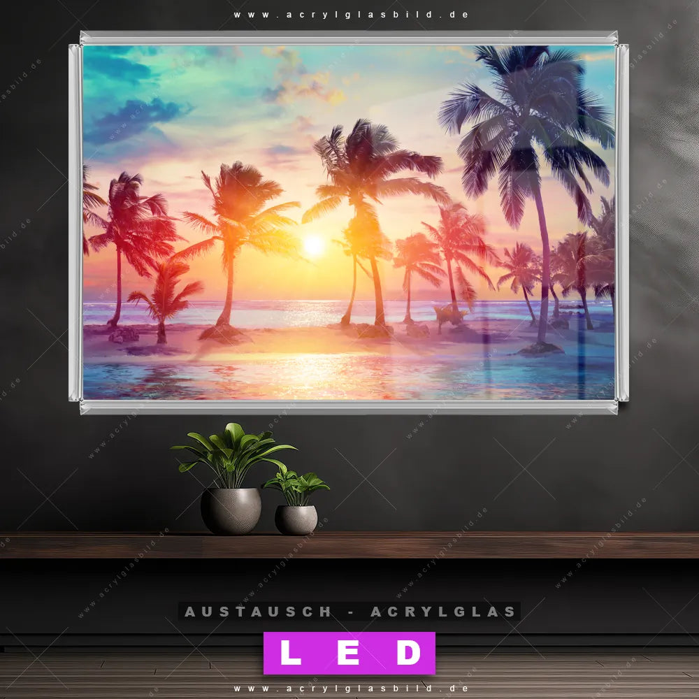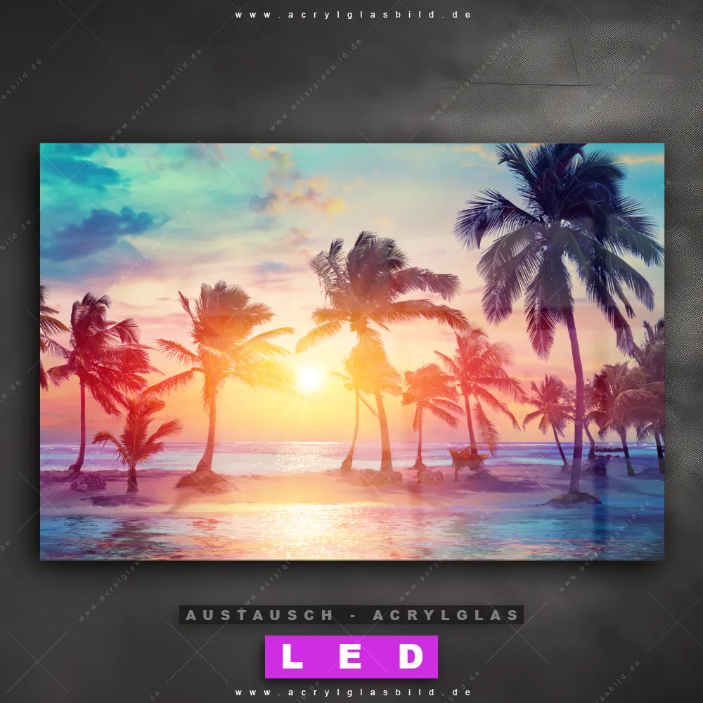 Begriffe wie Ozean, Wasser, Küste, Horizont, Wellen, Sand, Palmen, Insel, Südsee - Karibik, Urlaub - Reisen, Sonnenuntergang - Sonnenaufgang haben dich auf der Suche nach deinem neuen Austausch-Acrylglasbild inspiriert? Dann sollte das Wechsel-Acrylglasbild Palmen im Sommerwind für dein bereits vorhandenes LED Acrylglasbild Canvalight® DIA den Weg zu dir finden.
