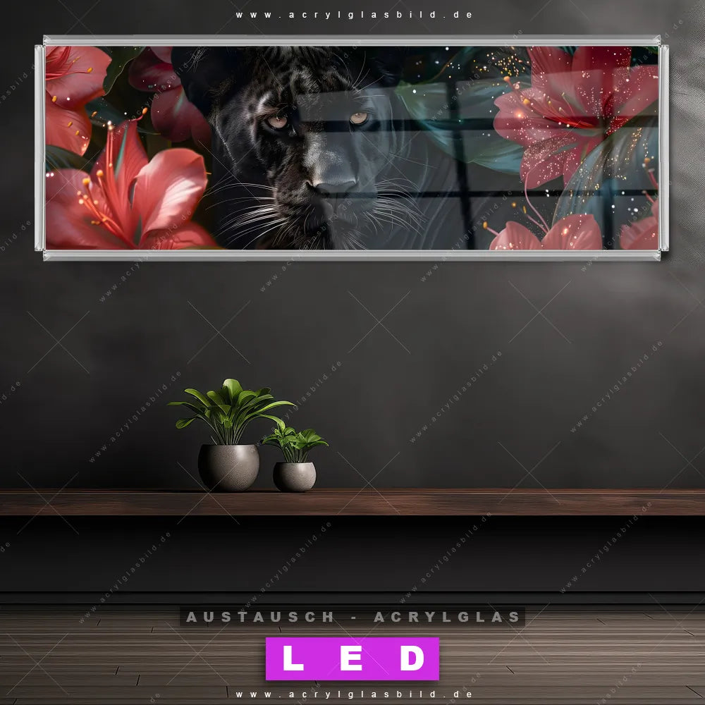 Wechsel-Acrylglas Canvalight® DIA | Panther und rote Blüten | Panorama