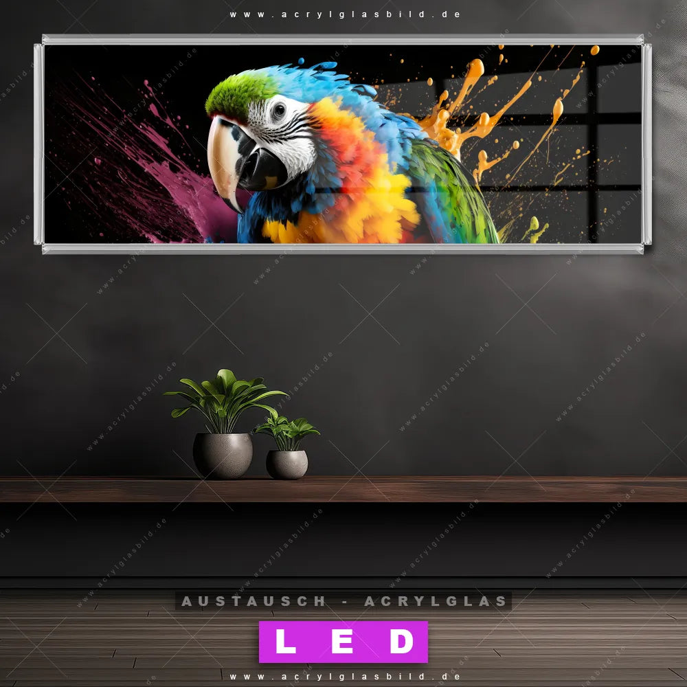 Wechsel-Acrylglas Canvalight® DIA | Papagei mit bunten Farbspritzern | Panorama