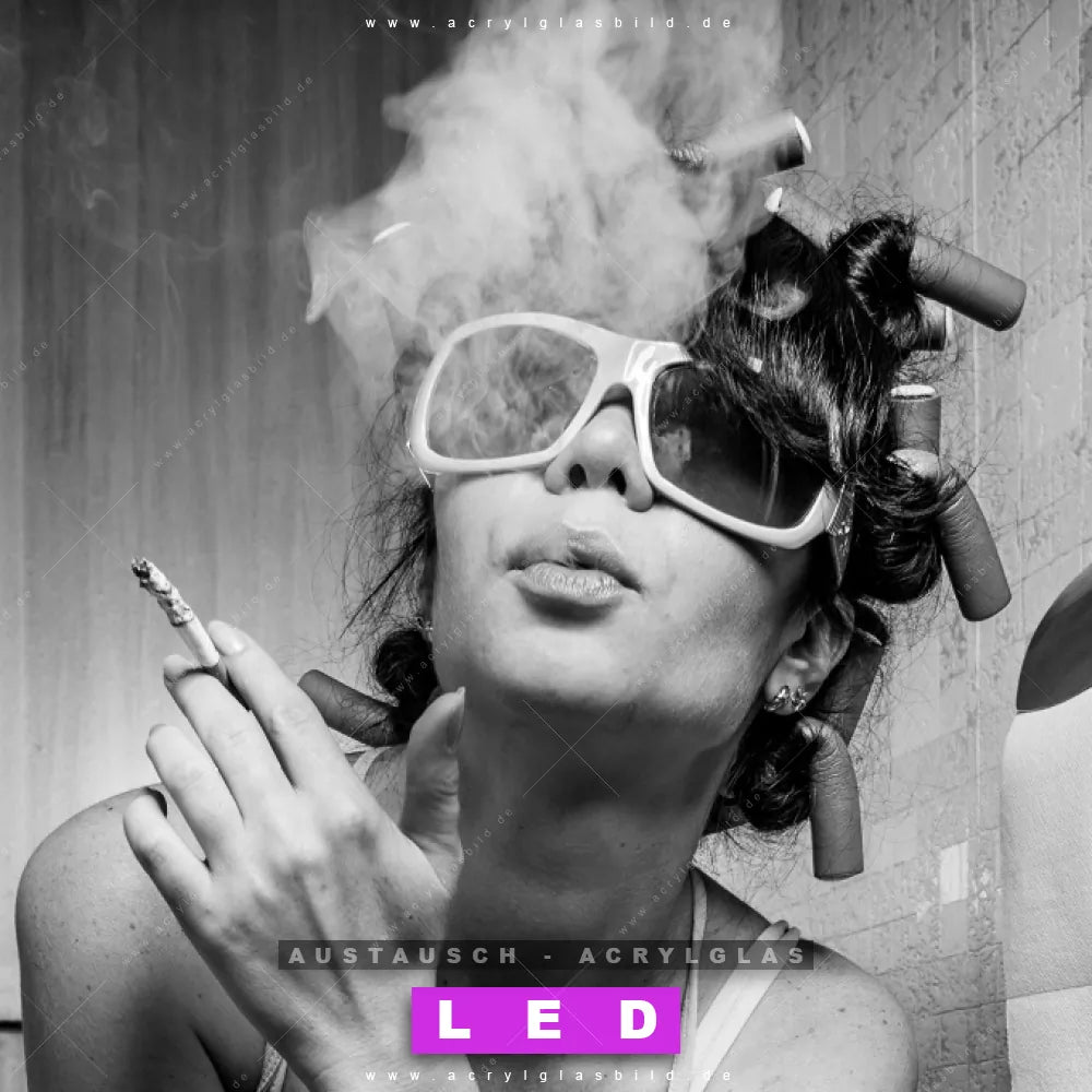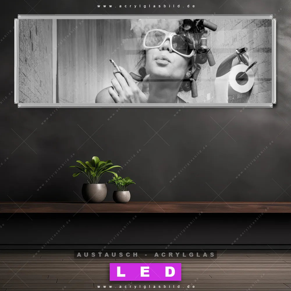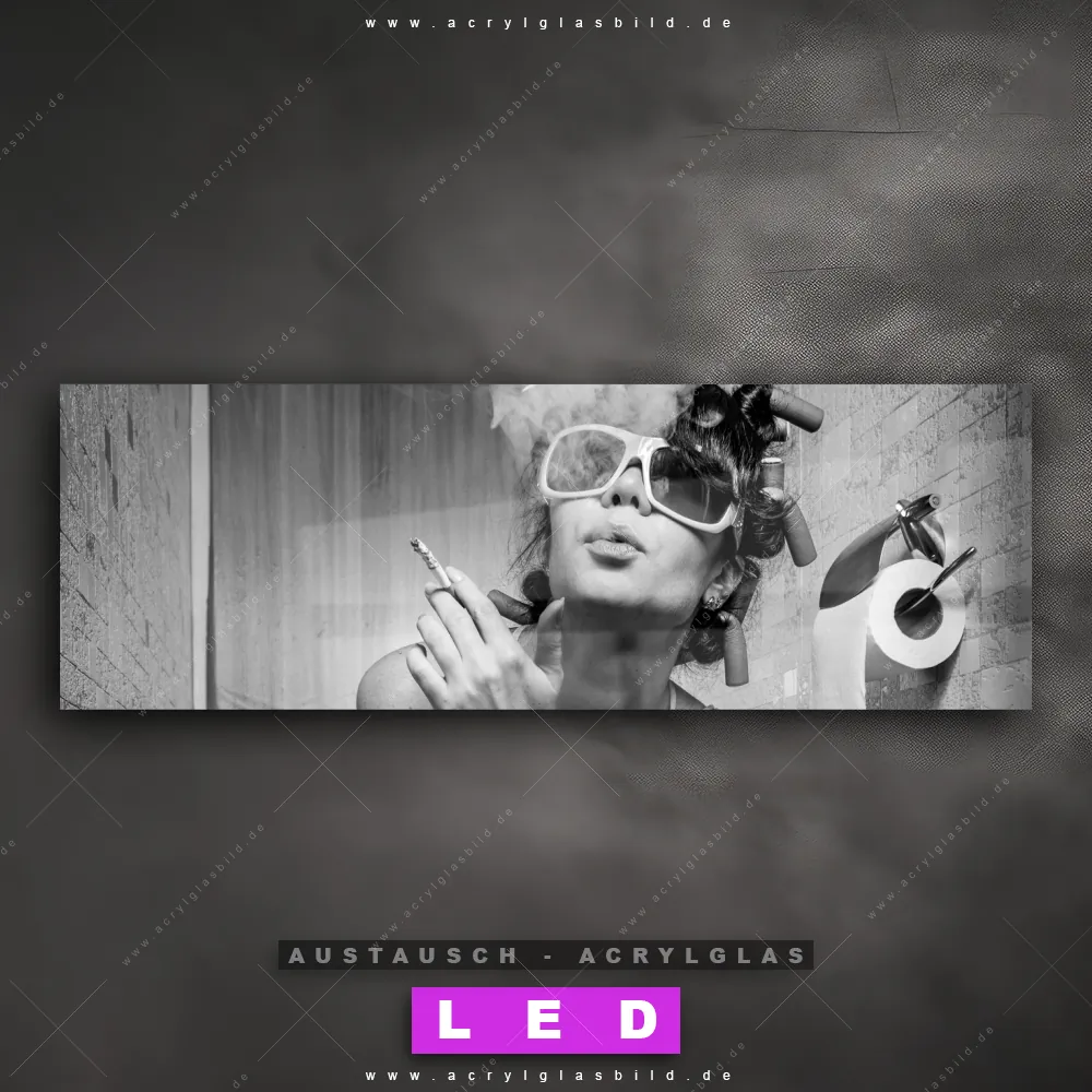 Begriffe wie Frau, Erotik, modern, sexy, Alkohol, Zigarette, rauchen, Toilette, WC, Party, Sonnenbrille haben dich auf der Suche nach deinem neuen Austausch-Acrylglasbild inspiriert? Dann sollte das Wechsel-Acrylglasbild feiernde Frau für dein bereits vorhandenes LED Acrylglasbild Canvalight® DIA den Weg zu dir finden.