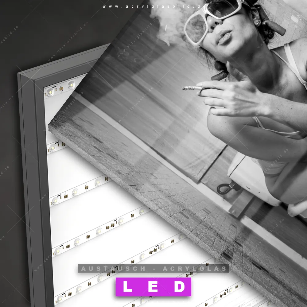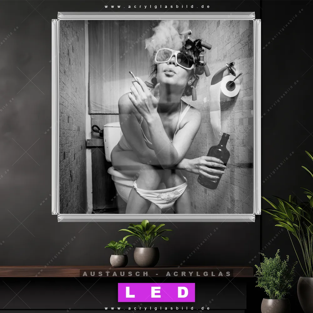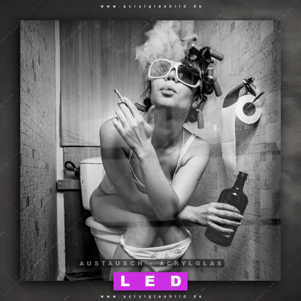 Begriffe wie Frau, Erotik, modern, sexy, Alkohol, Zigarette, rauchen, Toilette, WC, Party, Sonnenbrille haben dich auf der Suche nach deinem neuen Austausch-Acrylglasbild inspiriert? Dann sollte das Wechsel-Acrylglasbild feiernde Frau für dein bereits vorhandenes LED Acrylglasbild Canvalight® DIA den Weg zu dir finden.