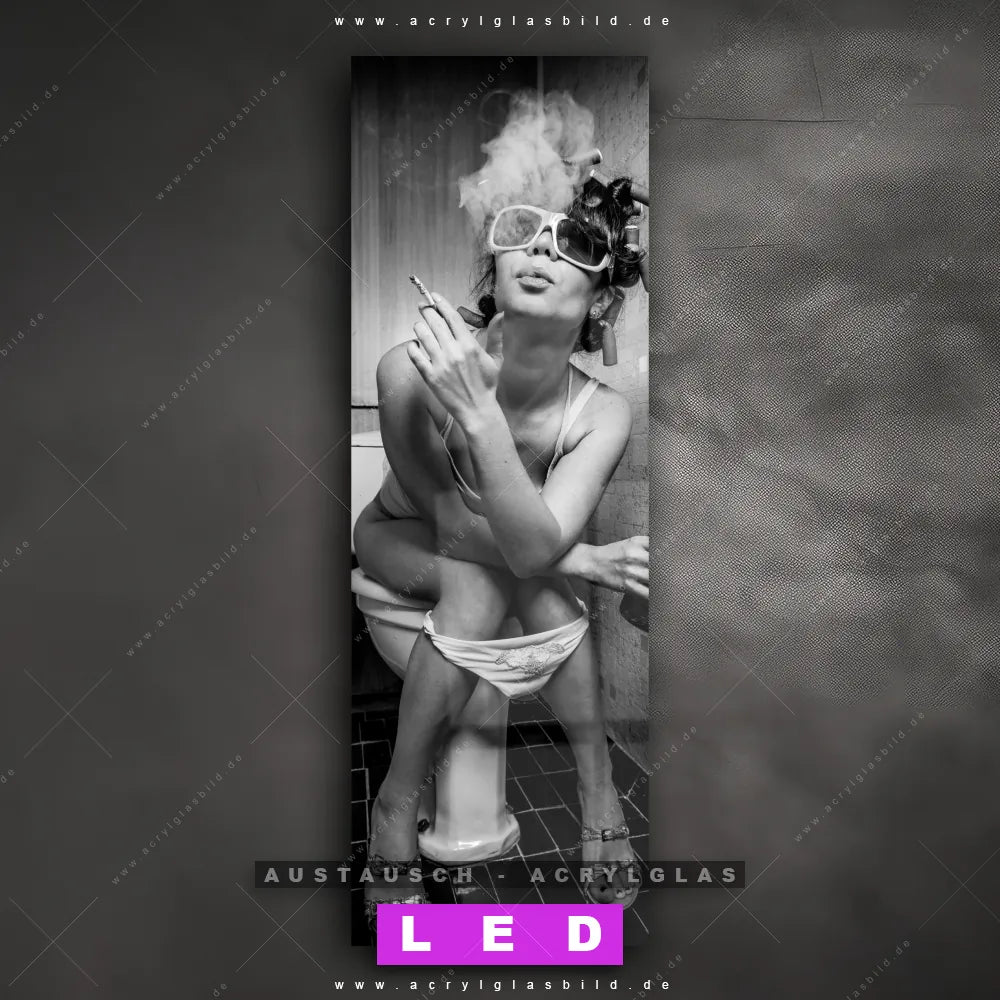 Begriffe wie Frau, Erotik, modern, sexy, Alkohol, Zigarette, rauchen, Toilette, WC, Party, Sonnenbrille haben dich auf der Suche nach deinem neuen Austausch-Acrylglasbild inspiriert? Dann sollte das Wechsel-Acrylglasbild feiernde Frau für dein bereits vorhandenes LED Acrylglasbild Canvalight® DIA den Weg zu dir finden.