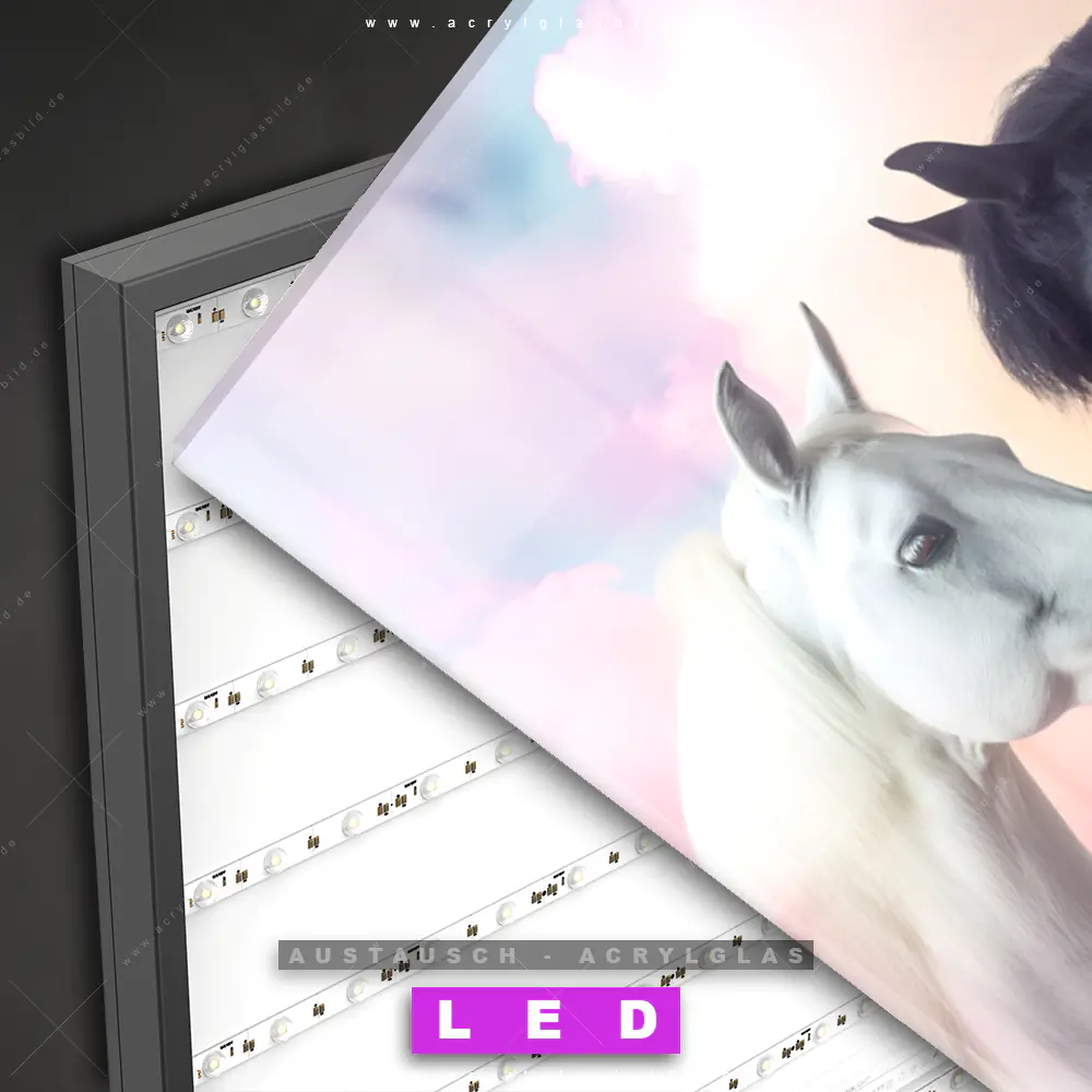 Begriffe wie Hengst, Stute, Pony, Pferde, Wolken, Nebel, Farbnebel, Ross haben dich auf der Suche nach deinem neuen Austausch-Acrylglasbild inspiriert? Dann sollte das Wechsel-Acrylglasbild Zwei Pferde in Wolken für dein bereits vorhandenes LED Acrylglasbild Canvalight® DIA den Weg zu dir finden.