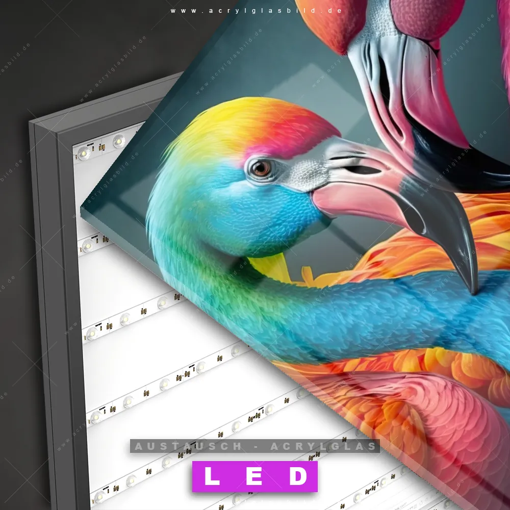 Begriffe wie Vogel, Flamingo, Dschungel, Wasser, Farbe, Regenbogen haben dich auf der Suche nach deinem neuen Austausch-Acrylglasbild inspiriert? Dann sollte das Wechsel-Acrylglasbild Tanz der Flamingos für dein bereits vorhandenes LED Acrylglasbild Canvalight® DIA den Weg zu dir finden.