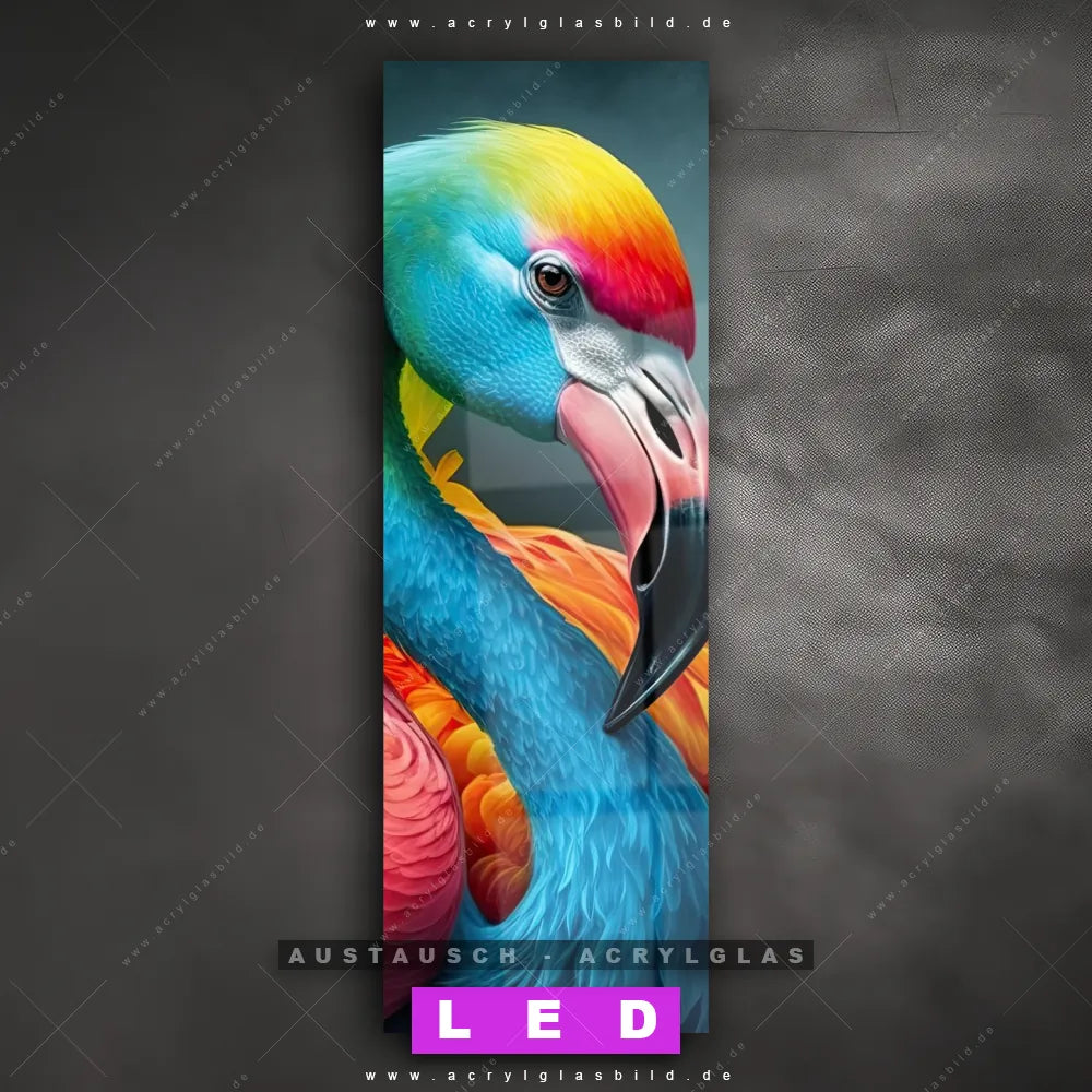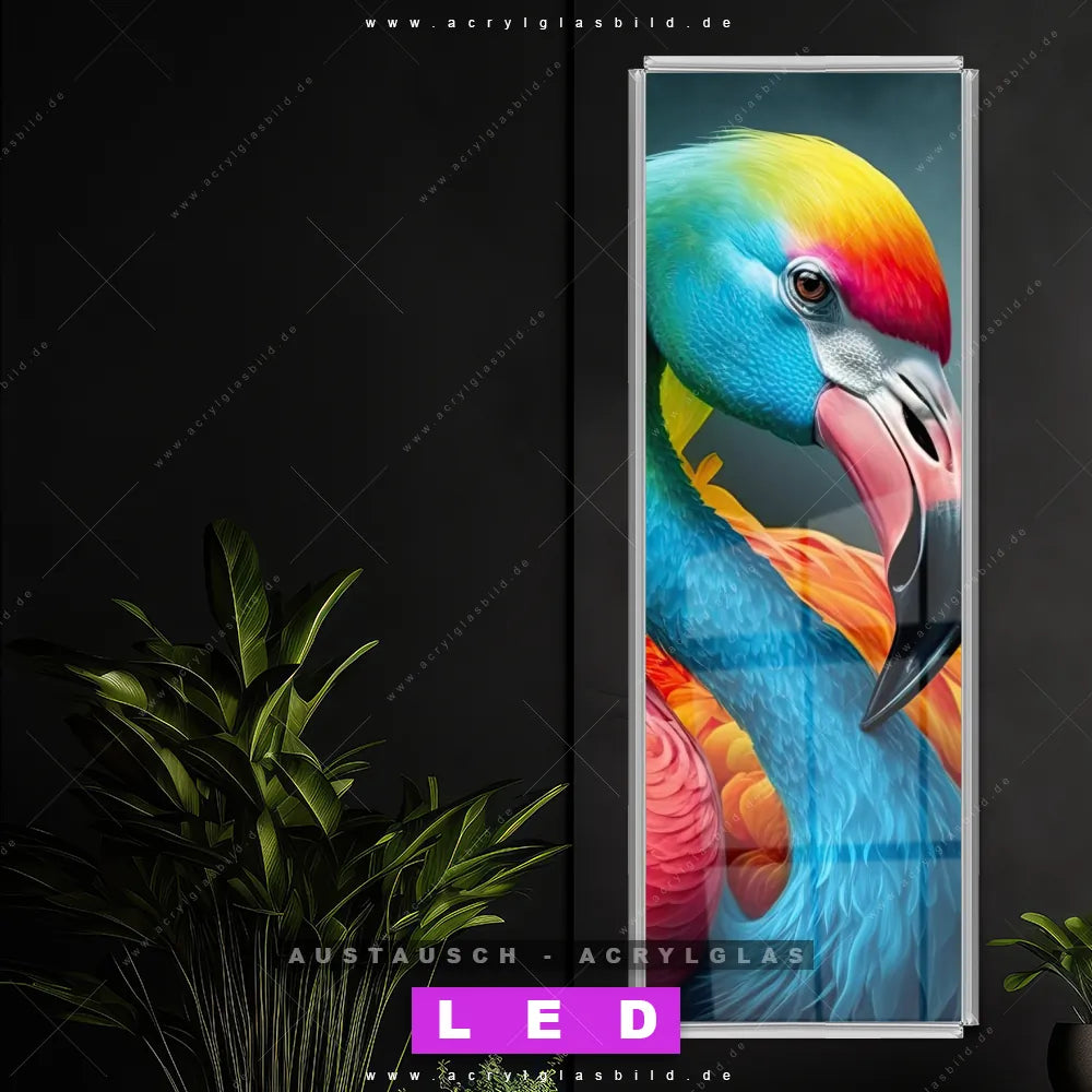 Begriffe wie Vogel, Flamingo, Dschungel, Wasser, Farbe, Regenbogen haben dich auf der Suche nach deinem neuen Austausch-Acrylglasbild inspiriert? Dann sollte das Wechsel-Acrylglasbild Tanz der Flamingos für dein bereits vorhandenes LED Acrylglasbild Canvalight® DIA den Weg zu dir finden.