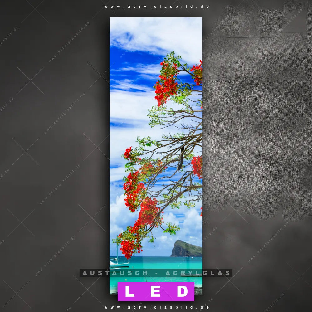 Begriffe wie Küste, Sommer, Natur, Blume, Boot, Baum, Felsen, Südsee - Karibik, Urlaub - Reisen haben dich auf der Suche nach deinem neuen Austausch-Acrylglasbild inspiriert? Dann sollte das Wechsel-Acrylglasbild Baumblüte am Meer für dein bereits vorhandenes LED Acrylglasbild Canvalight® DIA den Weg zu dir finden.