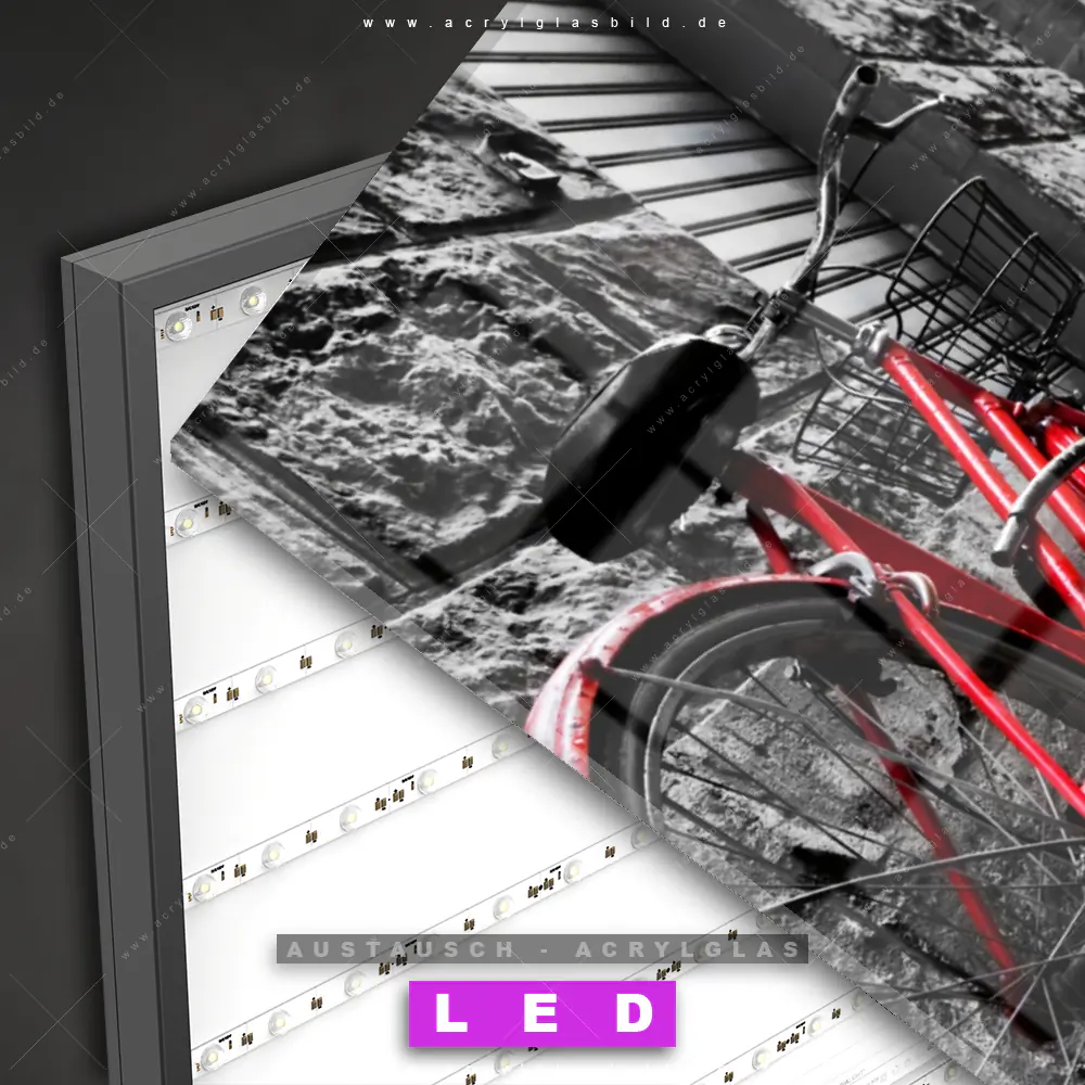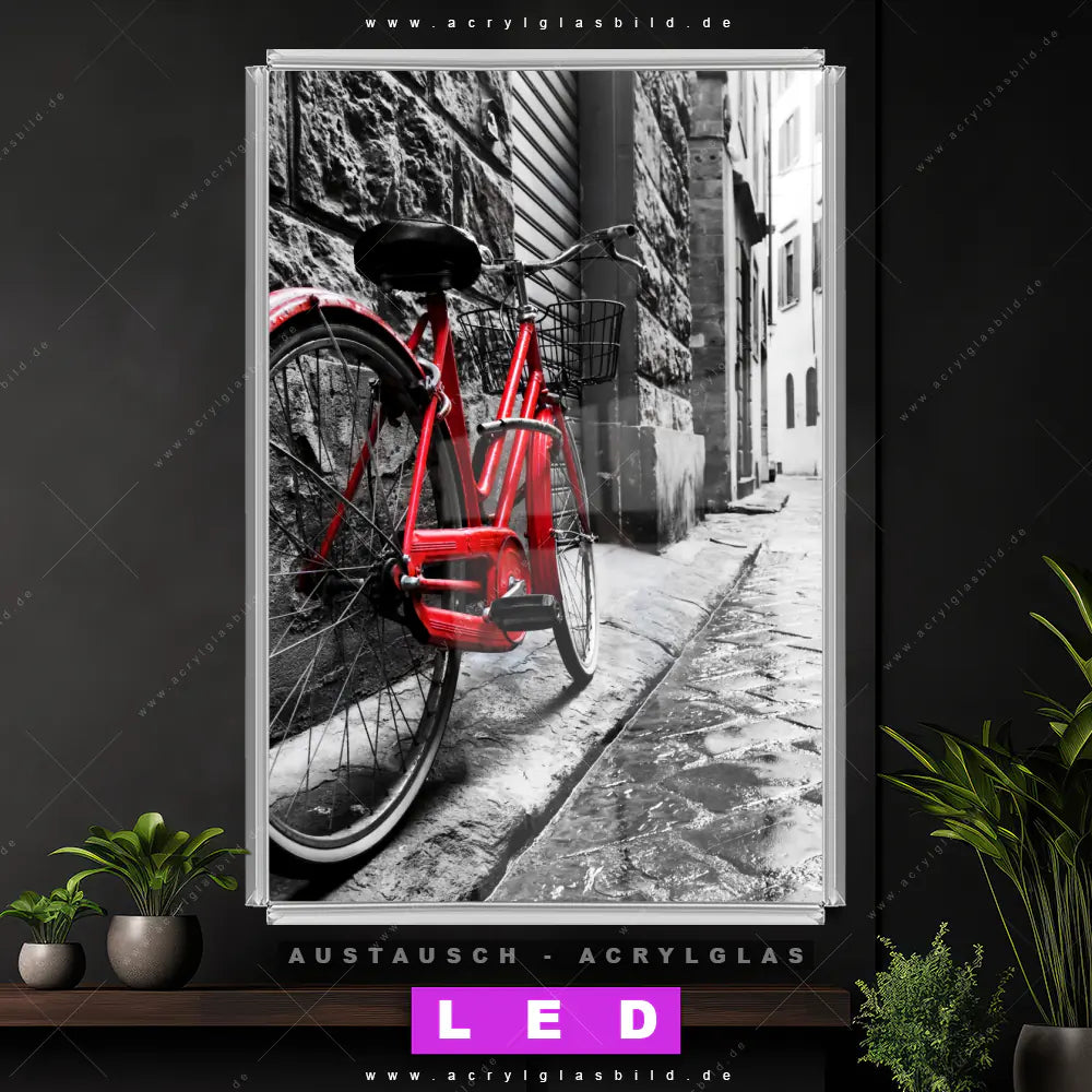 Wechsel-Acrylglas Canvalight® DIA | Rotes Fahrrad in Gasse | Hochformat
