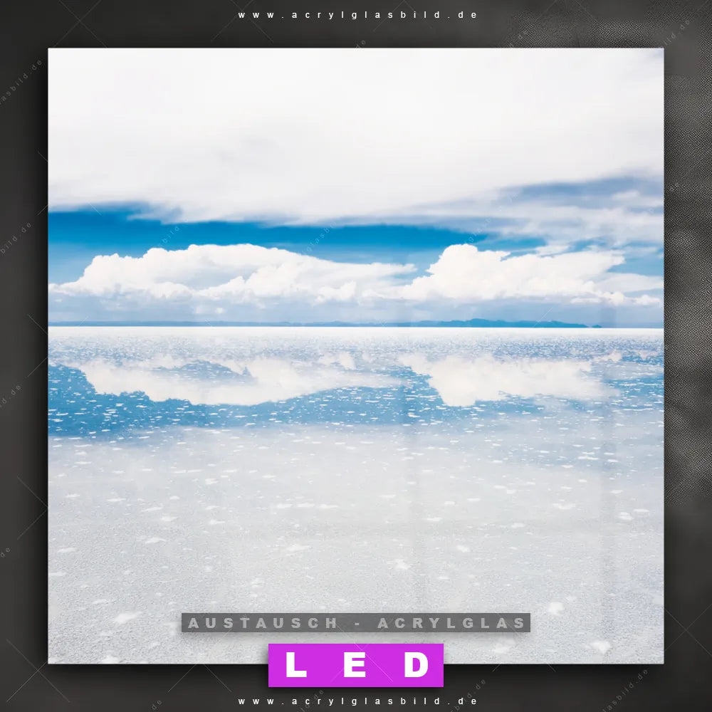 Begriffe wie Natur, See, Himmel, Spiegelung, Sehenswürdigkeit, Bolivien, Wasser, Wasserspiegelung haben dich auf der Suche nach deinem neuen Austausch-Acrylglasbild inspiriert? Dann sollte das Wechsel-Acrylglasbild Salzsee Reflexion für dein bereits vorhandenes LED Acrylglasbild Canvalight® DIA den Weg zu dir finden.
