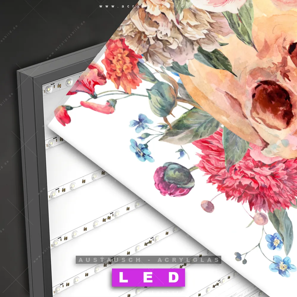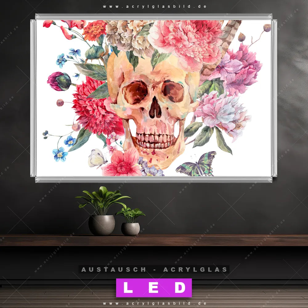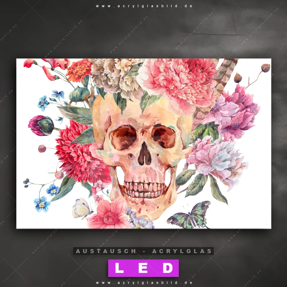 Begriffe wie Schädel, Totenkopf, Skelett, Skull, Knochen, Totenköpfe, Blumen, Blüten, Blätter, Federn, Schmetterling haben dich auf der Suche nach deinem neuen Austausch-Acrylglasbild inspiriert? Dann sollte das Wechsel-Acrylglasbild Schädel mit bunten Blumen für dein bereits vorhandenes LED Acrylglasbild Canvalight® DIA den Weg zu dir finden.