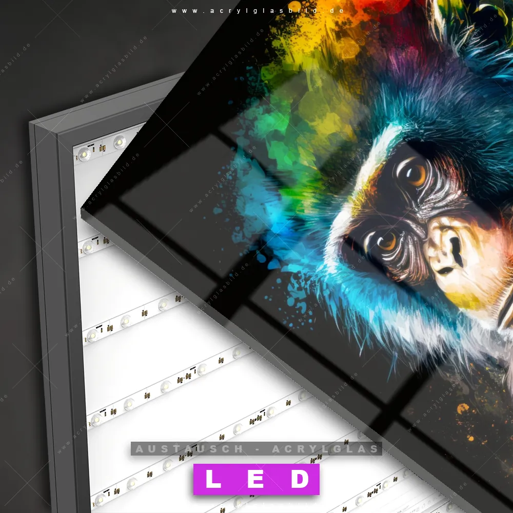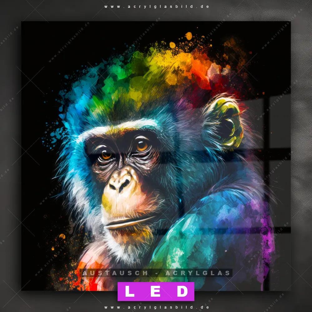 Begriffe wie Tier, Affe, Monkey, Chimpanzee, Schimpanse, Farbe, Farbspritzer haben dich auf der Suche nach deinem neuen Austausch-Acrylglasbild inspiriert? Dann sollte das Wechsel-Acrylglasbild Affe in bunten Farben für dein bereits vorhandenes LED Acrylglasbild Canvalight® DIA den Weg zu dir finden.